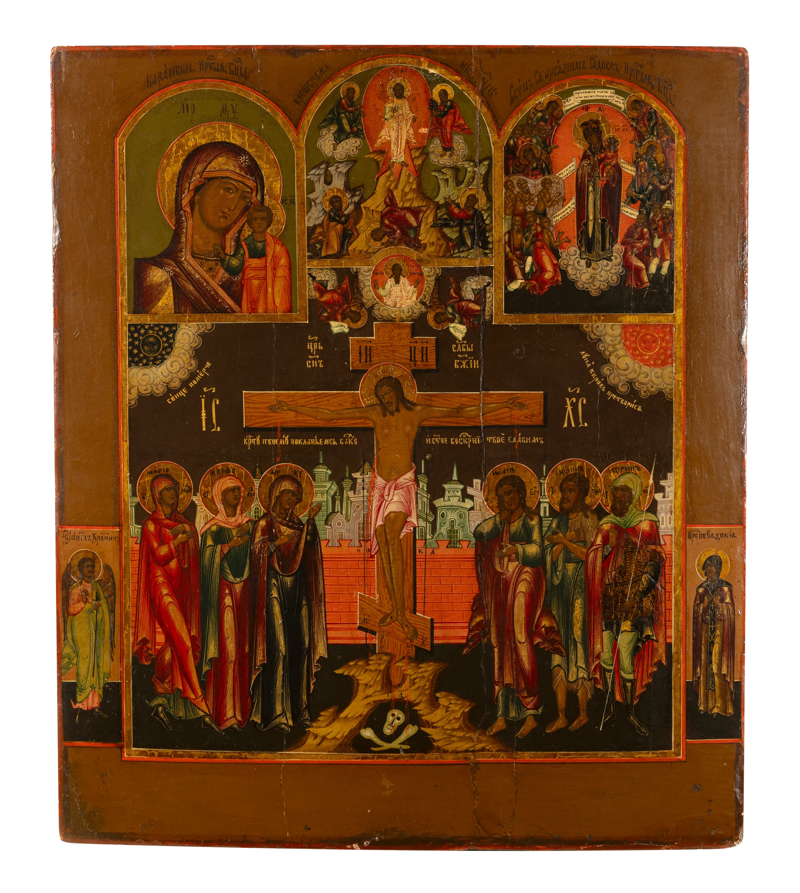 ICON ‘THE CRUCIFIXION WITH SAINTS’ Above ‘The Cross’ there are the images of the ‘Mother of God Kazanskaya’, ‘Transfiguration of the Lord’ and the ‘Mother of God, Joy of All Who Sorrow’. The margins feature images of the Guardian Angel and Saint Eudokia Guslitsy, late 19th century