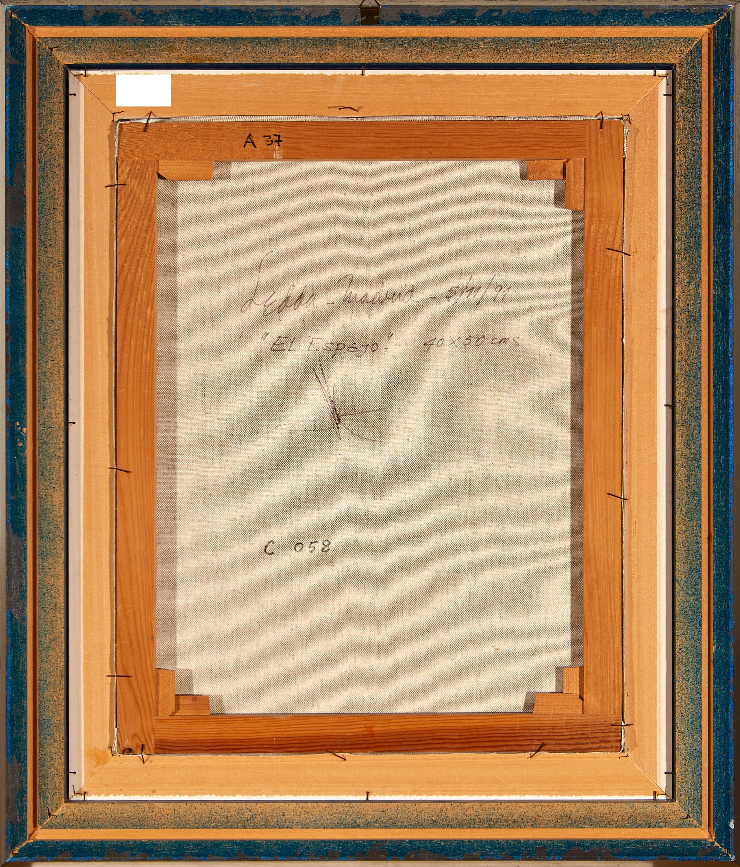 signed and dated 'Ledda 91'(lower right); signed, titled, located and dated 'Ledda-Madrid- 5/11/91 'El espejo'(on the reverse) oil on canvas 50 x 40 cm painted in 1991