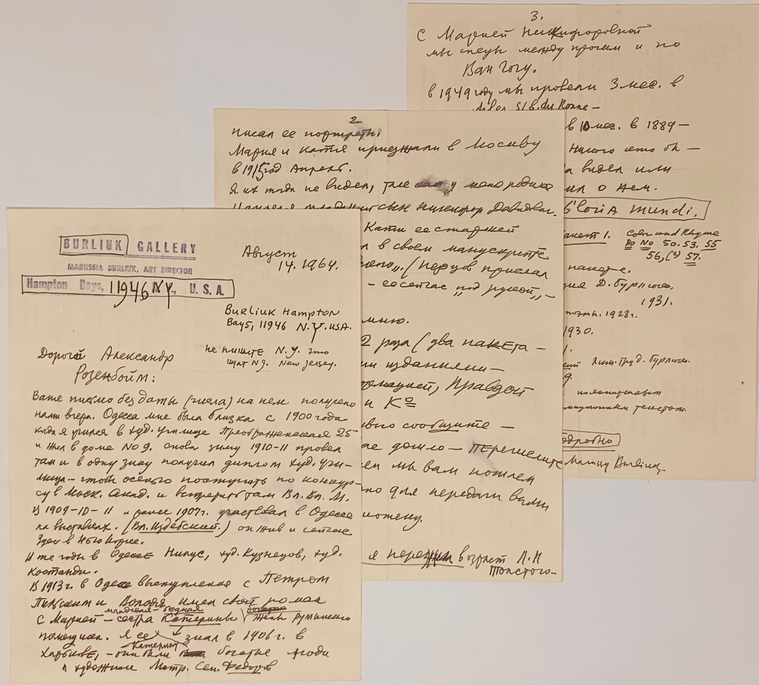 On the first page print "Burliuk Gallery. Marussia Burliuk, Art Director. Hampton Bays, 11946 NY, USA"and handwritten Burliuk's address in America.