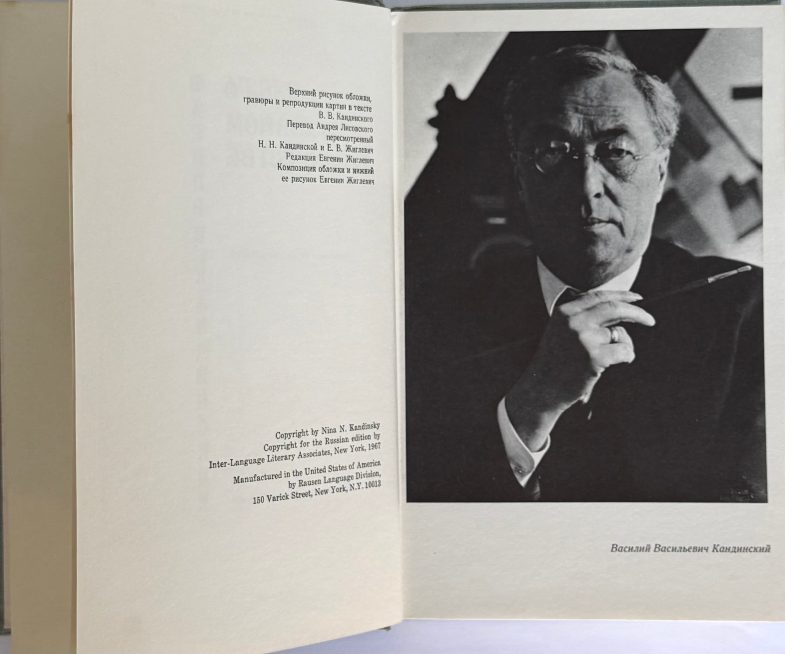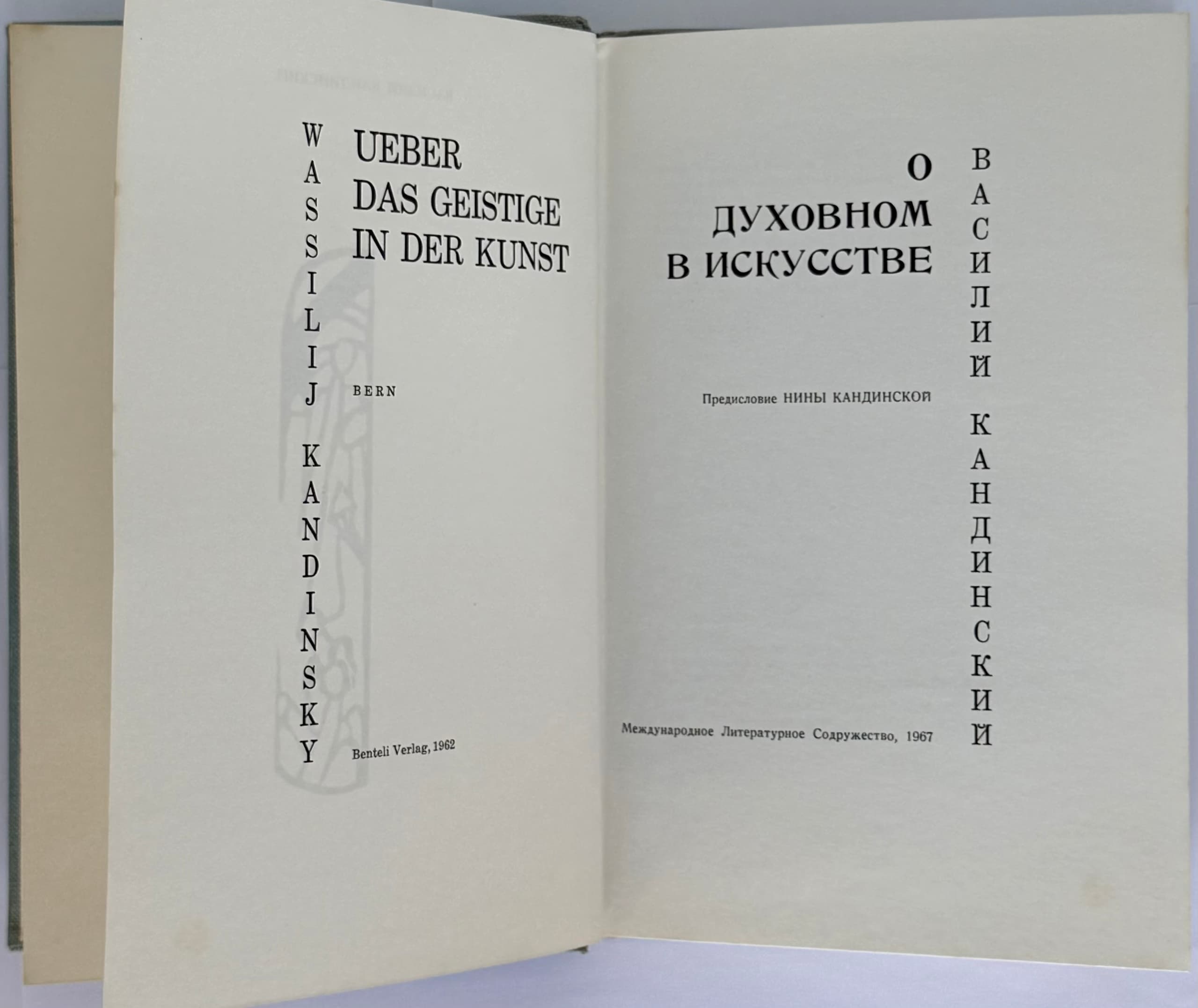 O dukhovnom v iskusstve ['On the Spiritual in Art']; preface by Nina Kandinskaya; translated by A. Lisovskiy. New York: Mezhdunarodnoe literaturnoe sodruzhestvo, 1967. — 160 pp.: ill.; 21.5 × 14 cm.