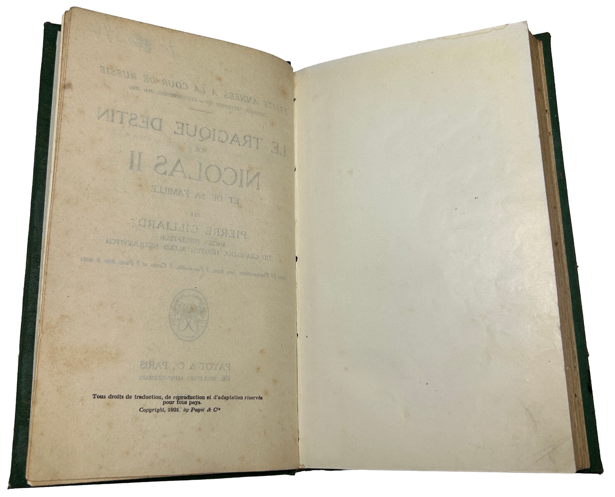 GILLIARD, PIERRE (1879–1962) The Tragic Fate of Nicholas II and His Family / by Pierre Gilliard. Paris: Payot, 1921. (Collection of memoirs, studies, and documents for the history of the World War). First edition.