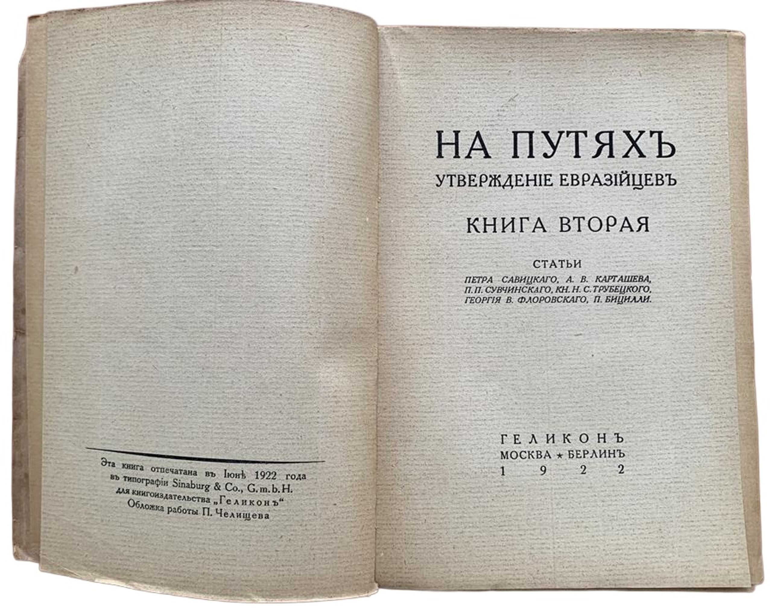 [EURASIANS] Na putyakh: utverzhdenie evraziytsev ['On the Trail: The Establishment of the Eurasians; Book 2; articles by Petr Savitskiy, A.V. Kartashev, P.P. Suvchinskiy, Prince N.S. Trubetskoy, Georgiy Florovskiy, P. Bicilli. Moscow; Berlin: Gelikon, 1922.
