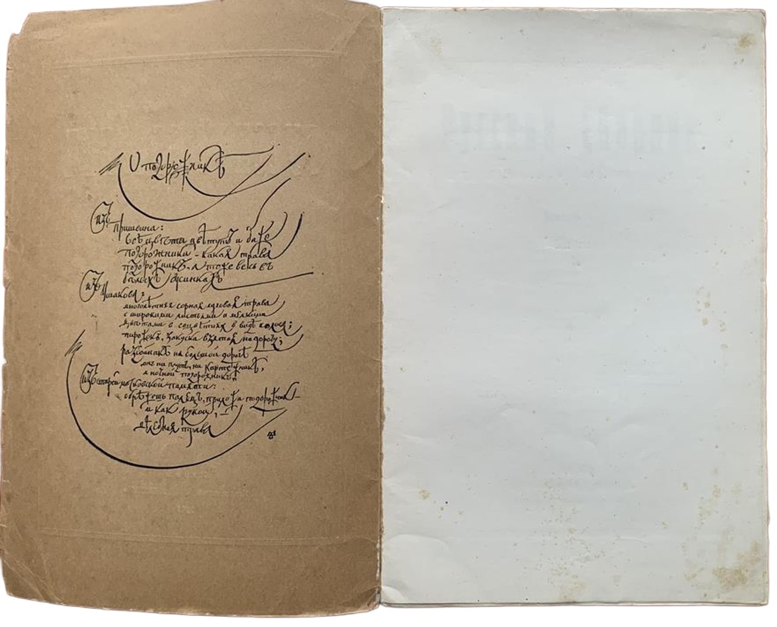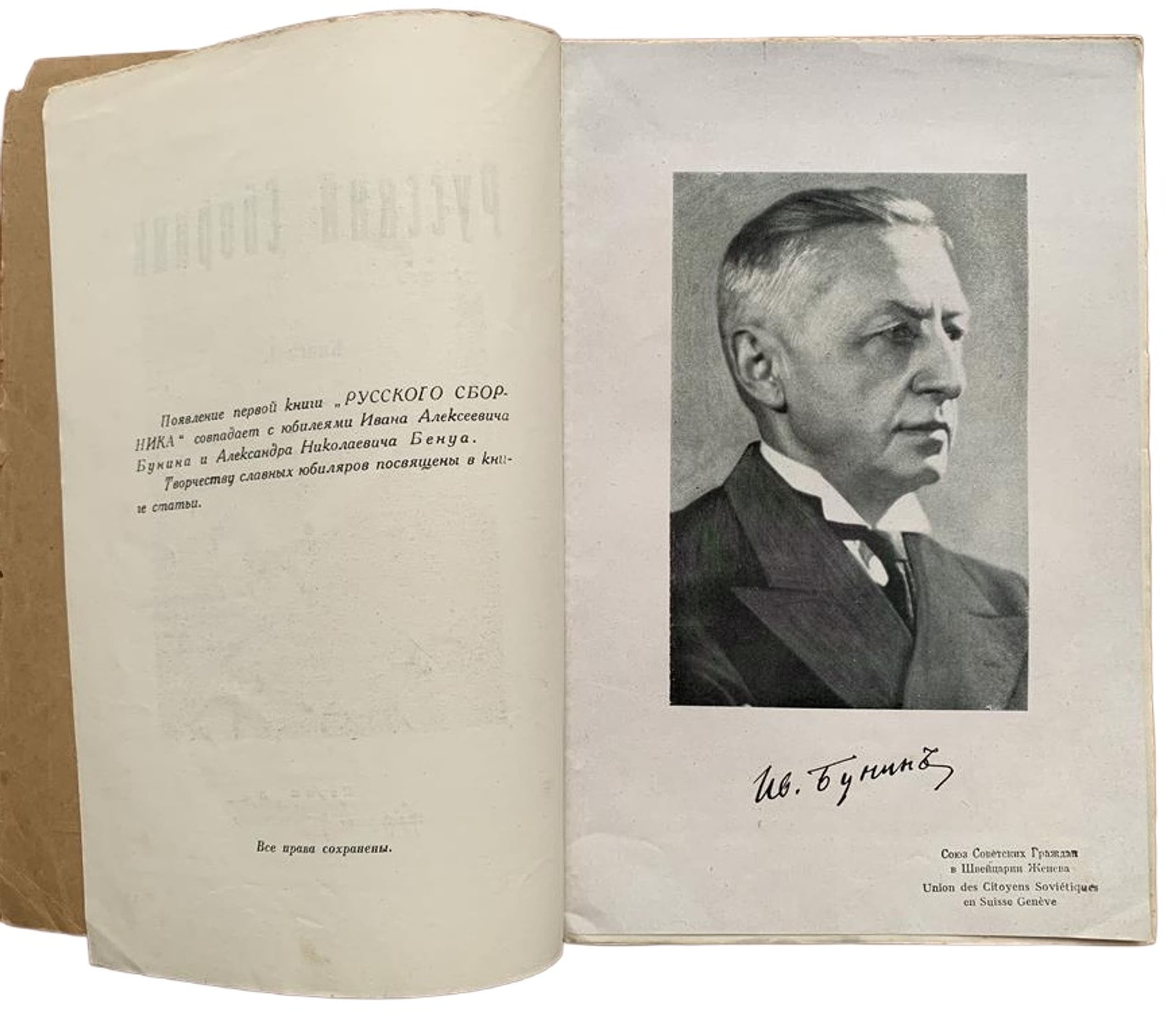 Portraits of I.A. Bunin and A.N. Benois on separate leaves; lithographed reproduction of A. Remizov’s calligraphic autograph ‘O podorozhnike’ on the inside of the rear wrapper.