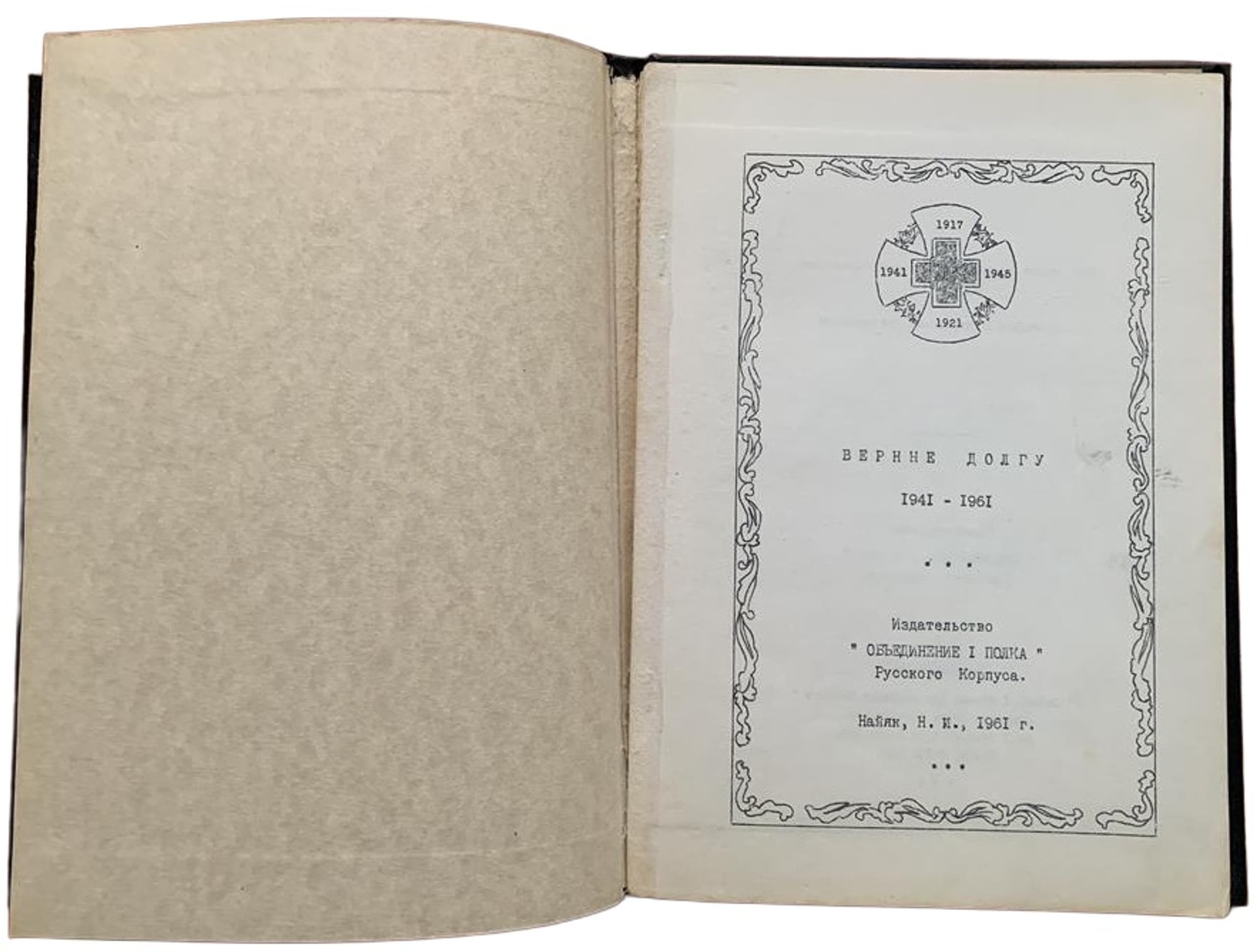 TRETYAKOV, V.I. (1897–1975) Vernye dolgu: 1941–1961 ['Faithful to Duty: 1941–1961']; compiled by V.I. Tret’yakov. Nyack [New York]: Izd. ‘Ob'edinenie I polka’ Russkogo korpusa, 1961.