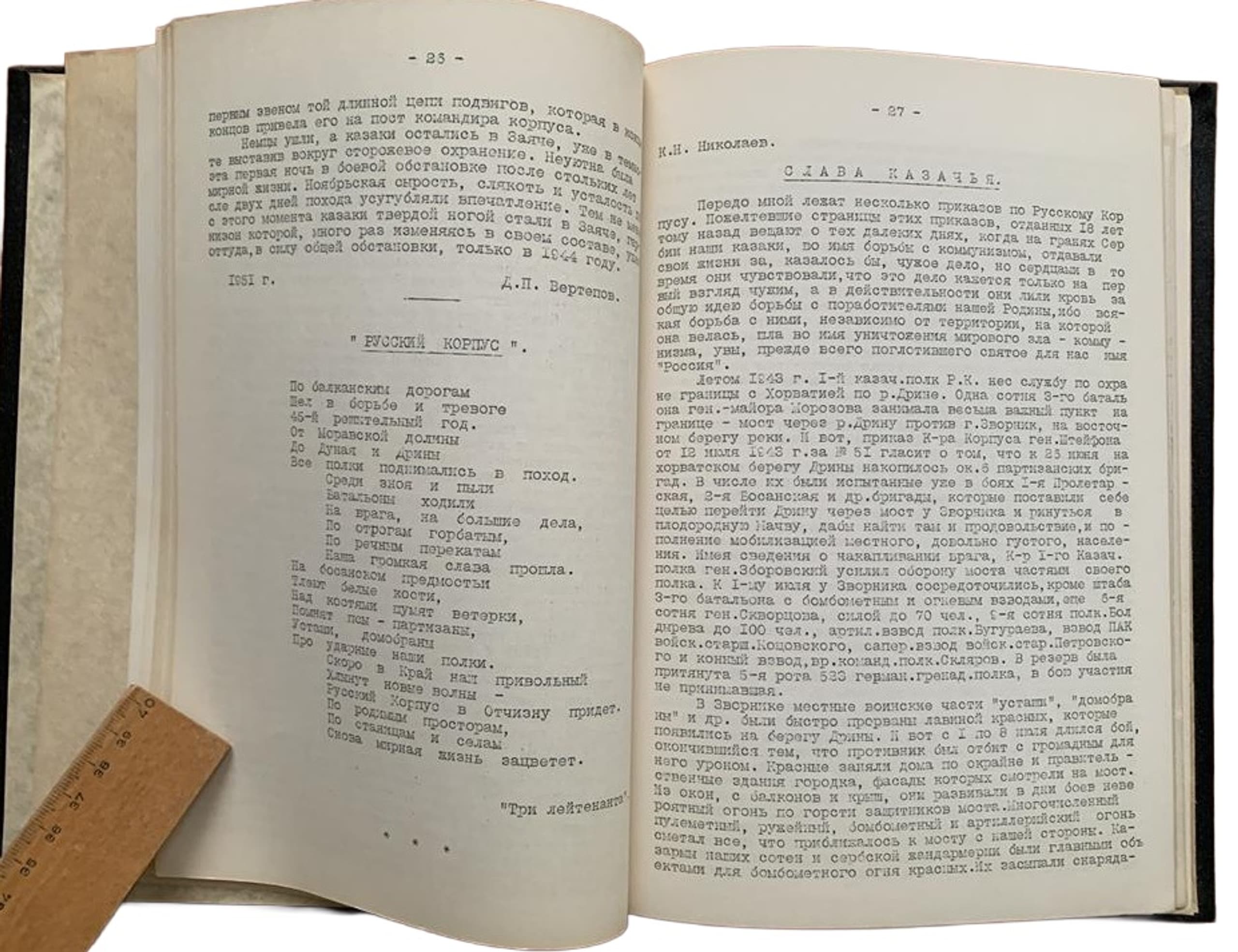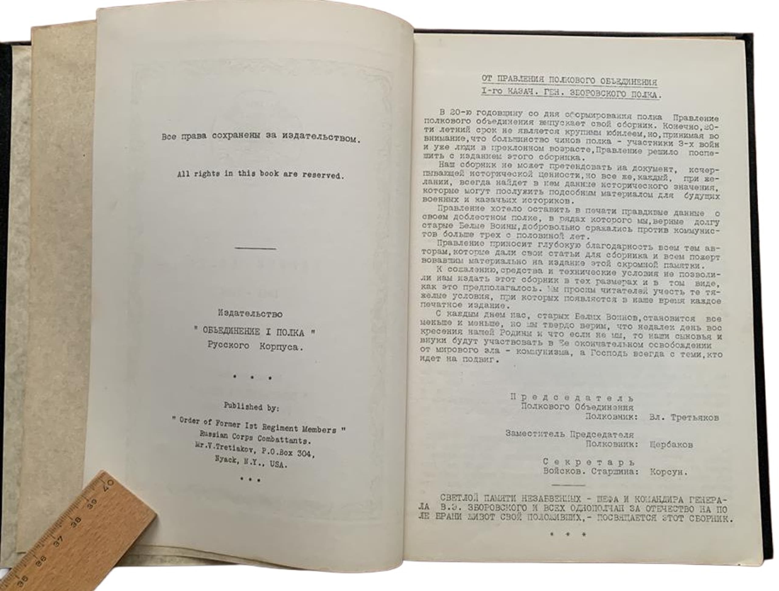 Published on the occasion of the 20th anniversary of the formation of the First Cossack General Zborovskiy Regiment (formerly the First Regiment of the Russian Corps). The volume includes articles and poems by members of the regiment, biographies of its notable figures, orders, and lists of missing, wounded and fallen soldiers.