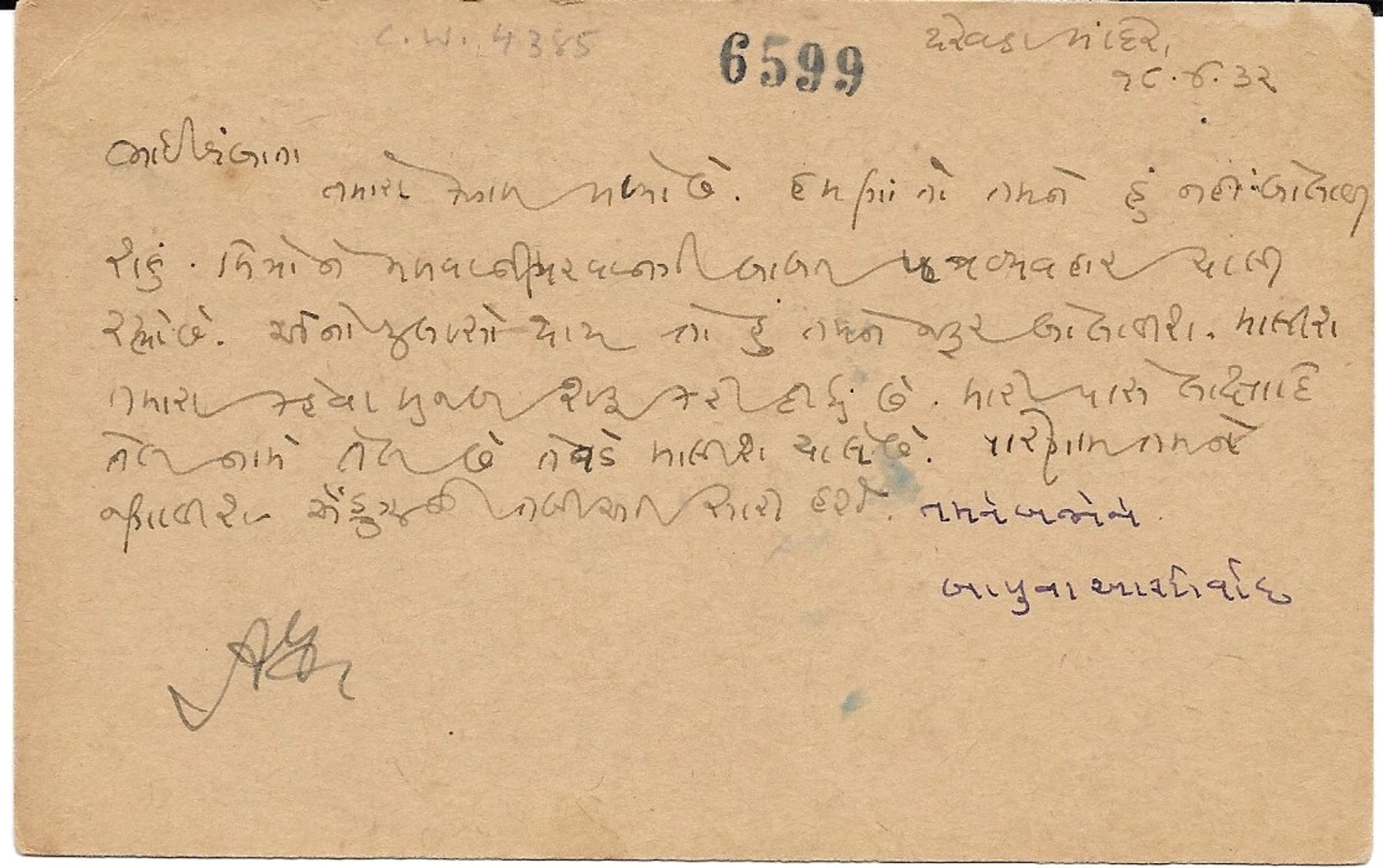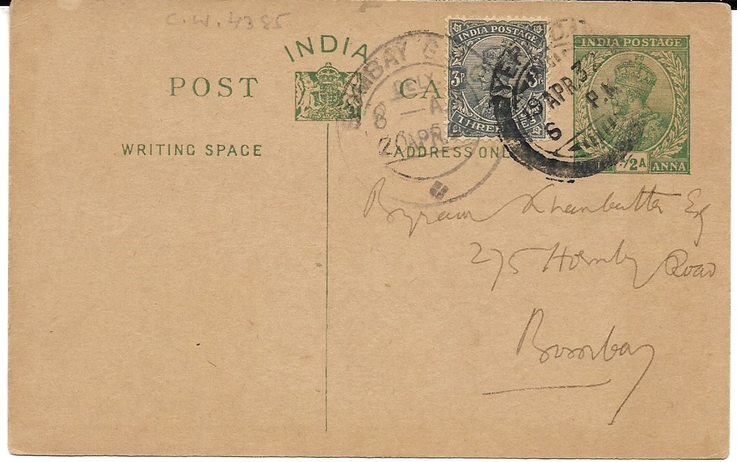 ink stamp No. 6599, on reverse: address, stamp, postmarks (Yerwada 19 APR. 32 Bombay 20 APR.)