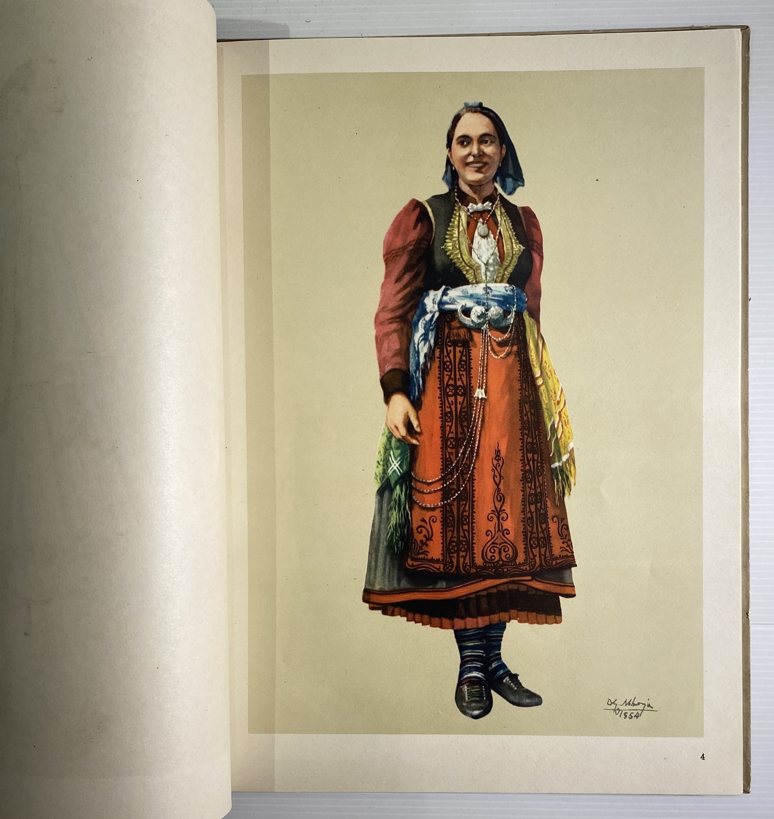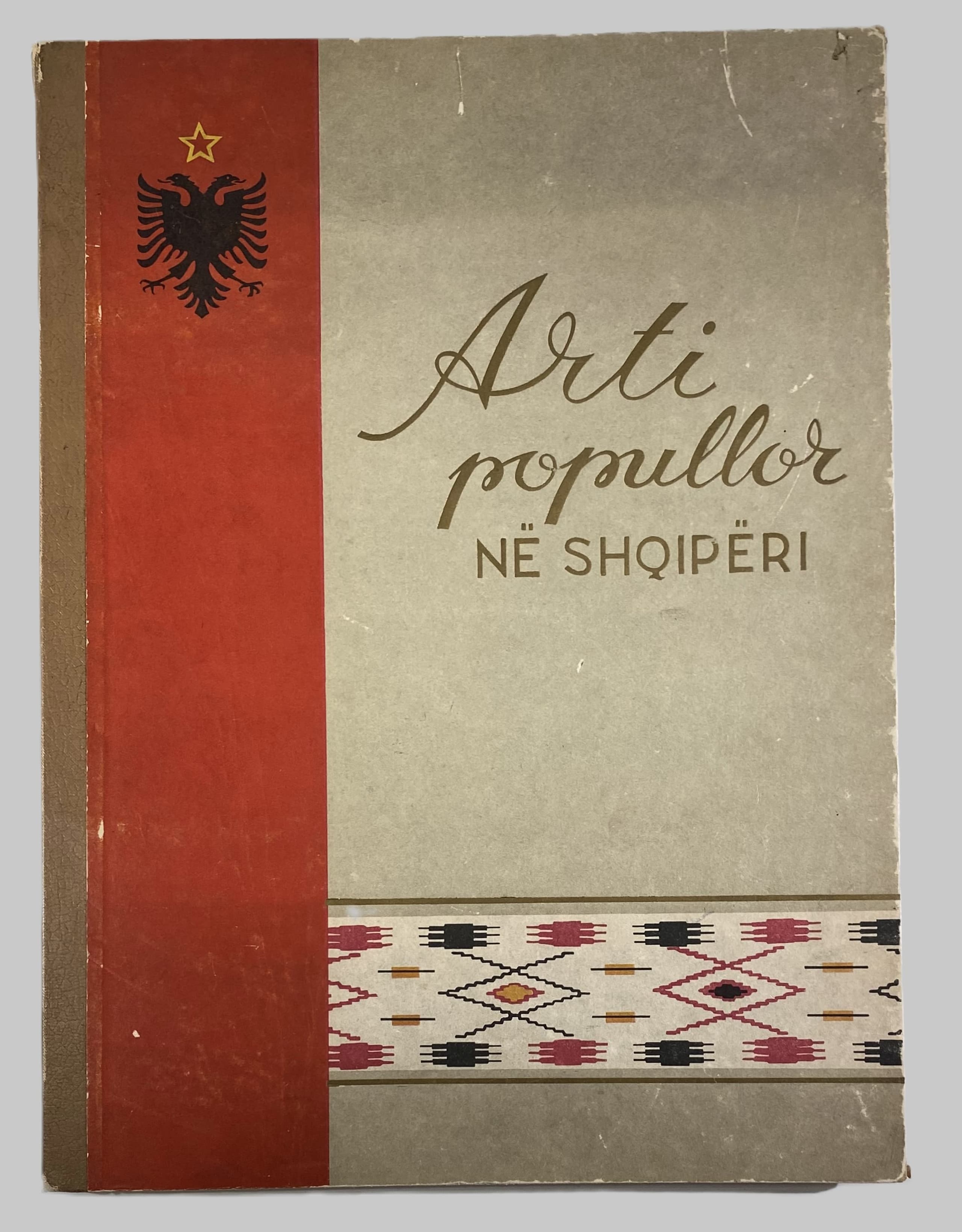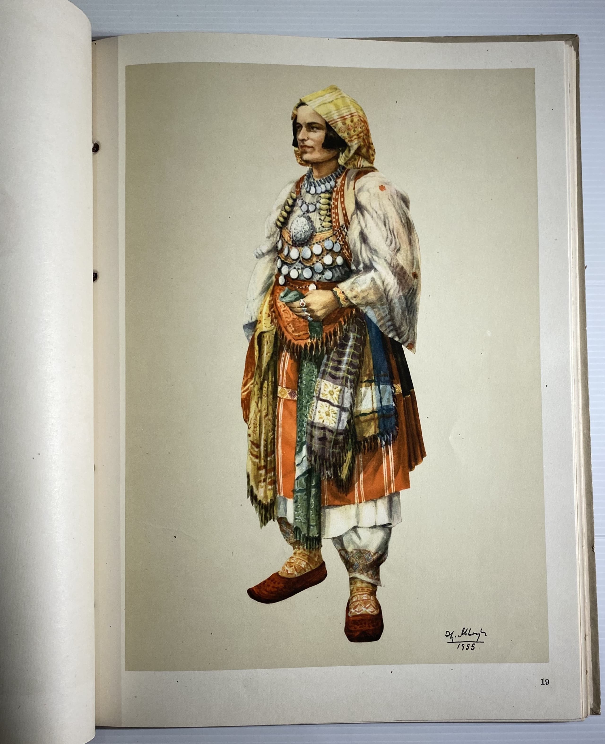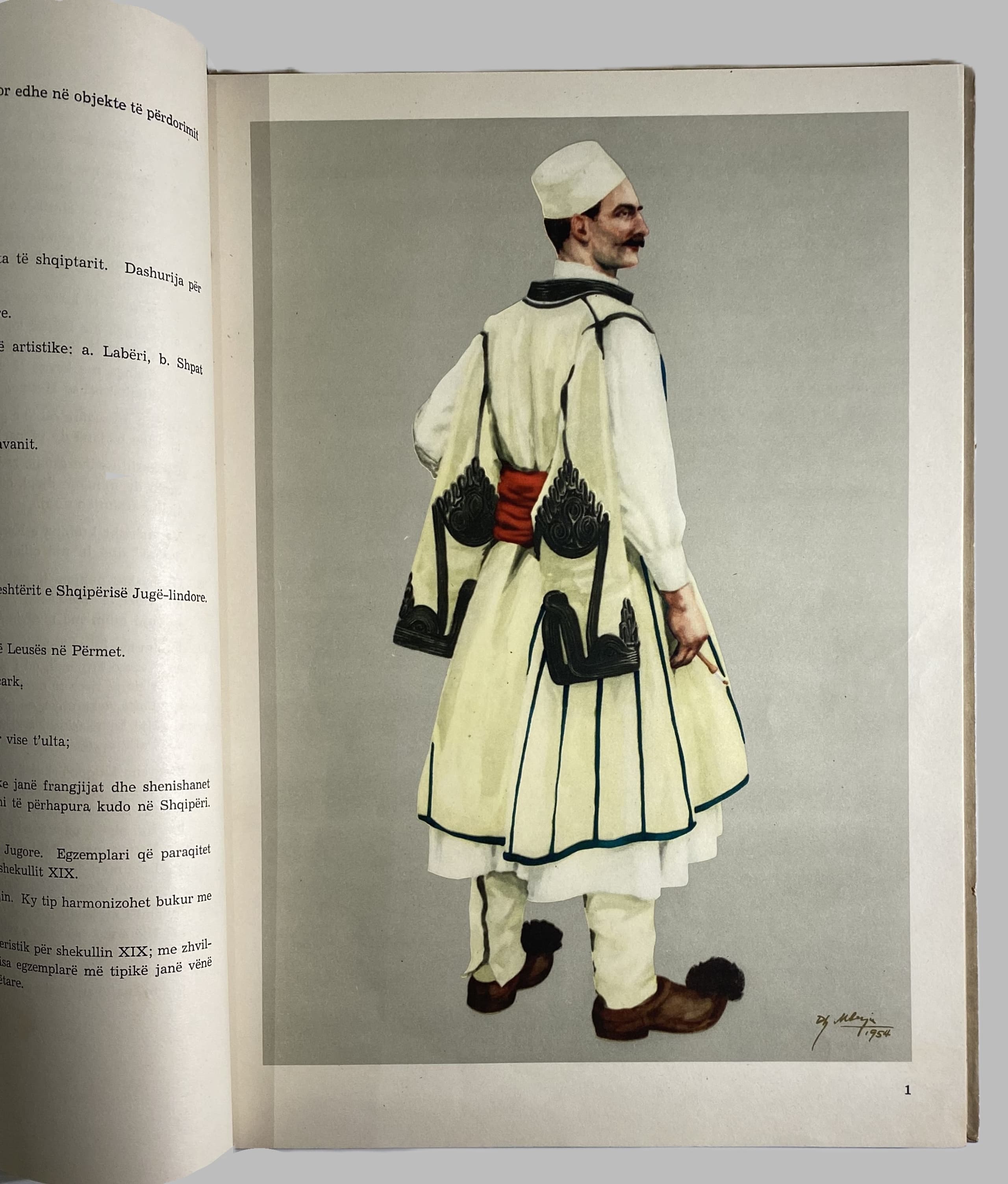 10 pp. 53 colour plates by Dhimiter Mborja printed full page, depicting a map of Albania, traditional costumes, dwellings and crafts (metal, wood).