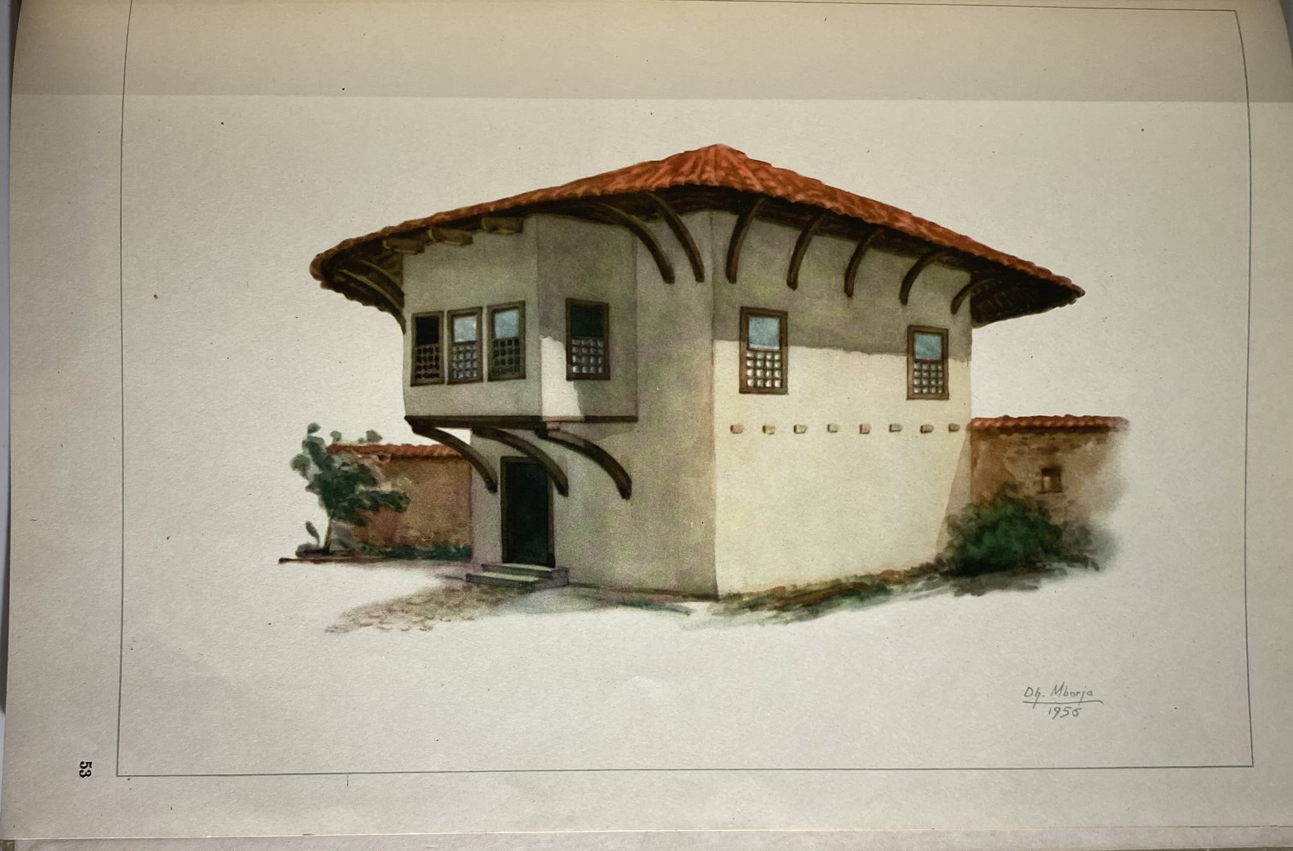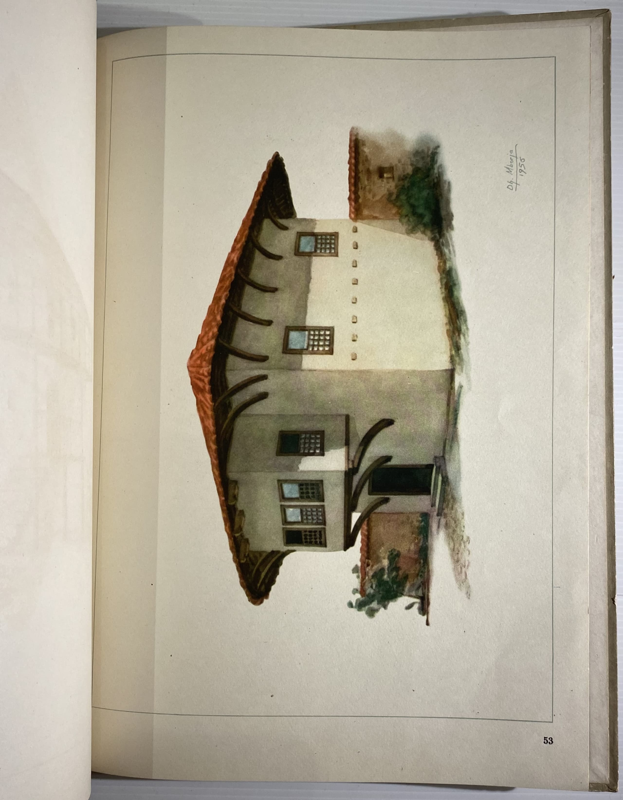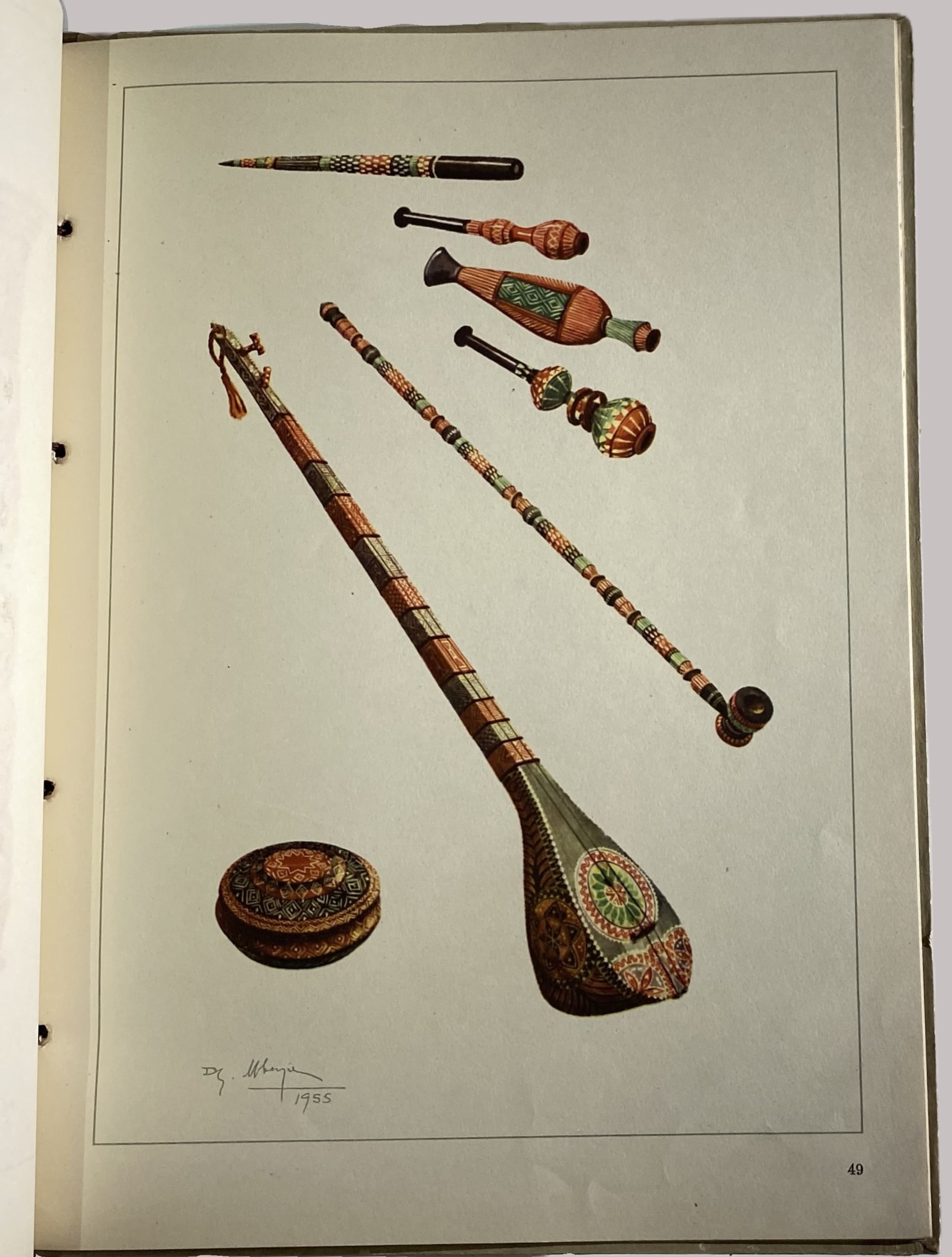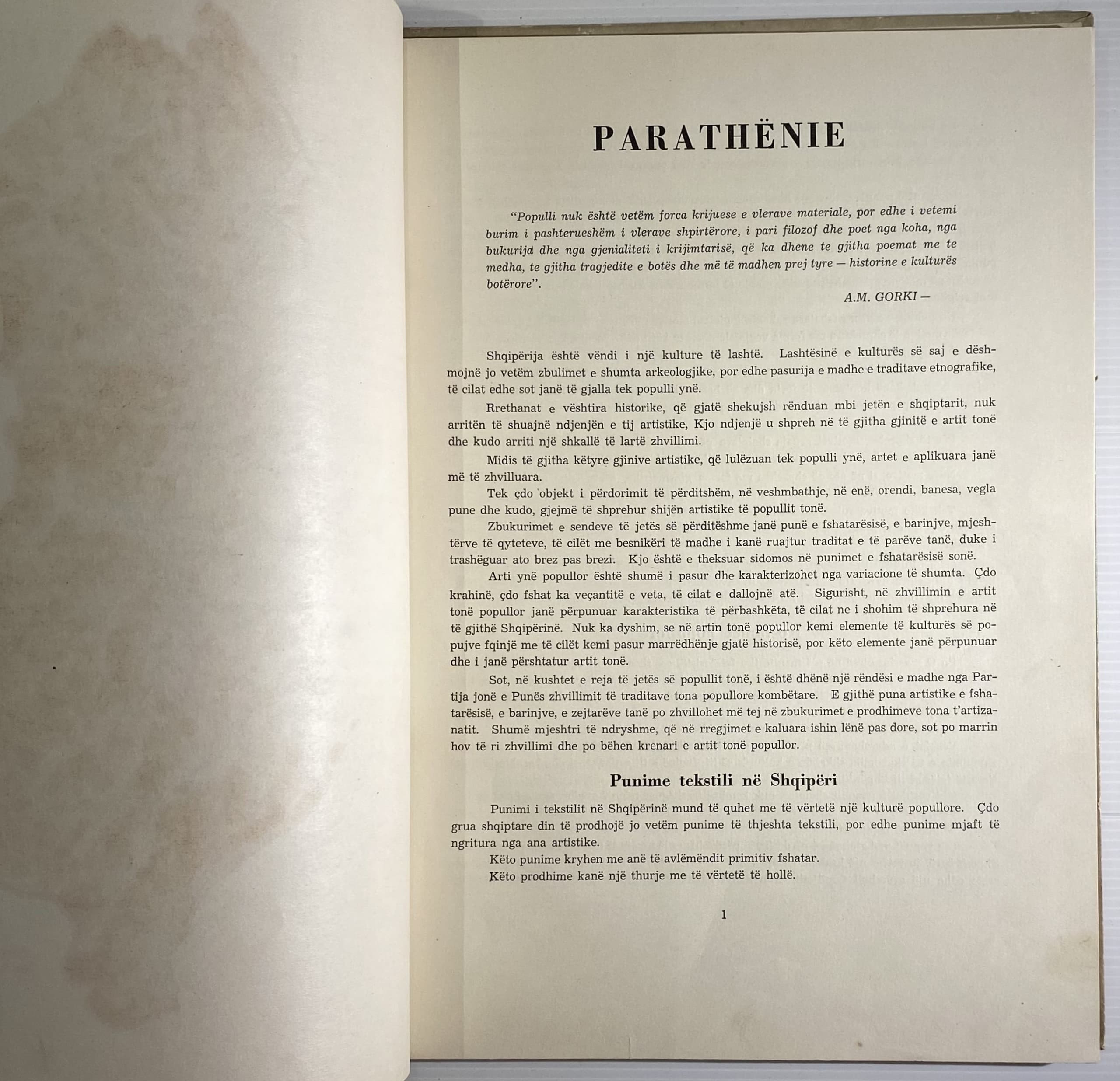 10 pp. 53 colour plates by Dhimiter Mborja printed full page, depicting a map of Albania, traditional costumes, dwellings and crafts (metal, wood).