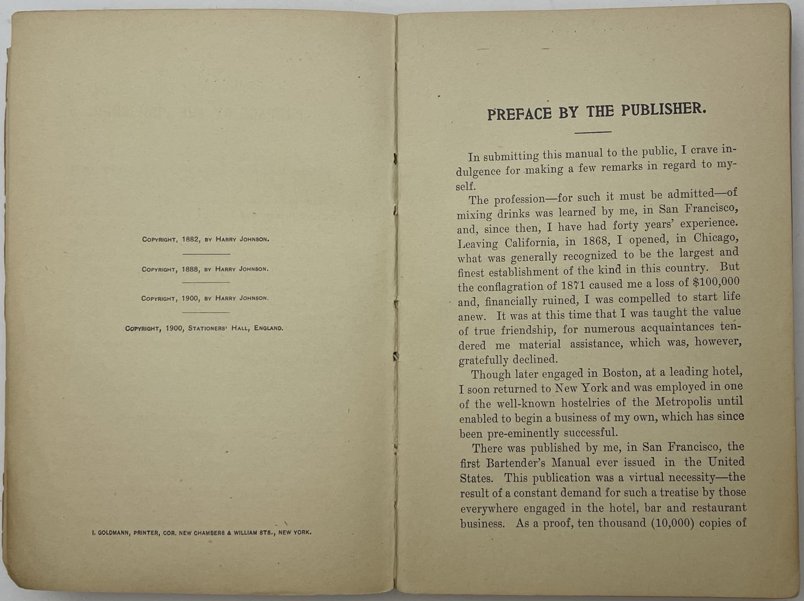 Harry Johnson, born in Prussia, began his career in the hospitality industry in San Francisco in 1861 before opening his first bar in Chicago around 1869, which was destroyed in the Great Fire of 1871. Having settled in New York, he bought the Little Jumbo in 1877. Author of ‘New and Improved Bartender’s Manual or How to Mix Drinks in the Present Style’ (1882), which he published himself in both English and German, he produced the first book to cover both modern recipes and the management and running of a cocktail bar. Around 1890, he gave up bartending to become a bar management consultant, a role he helped to pioneer. He thoroughly revised his manual and republished it in 1900. Although his fame remained limited during his lifetime, his book is now regarded as one of the major works of the 19th century on bartending, second only to that of Jerry Thomas.