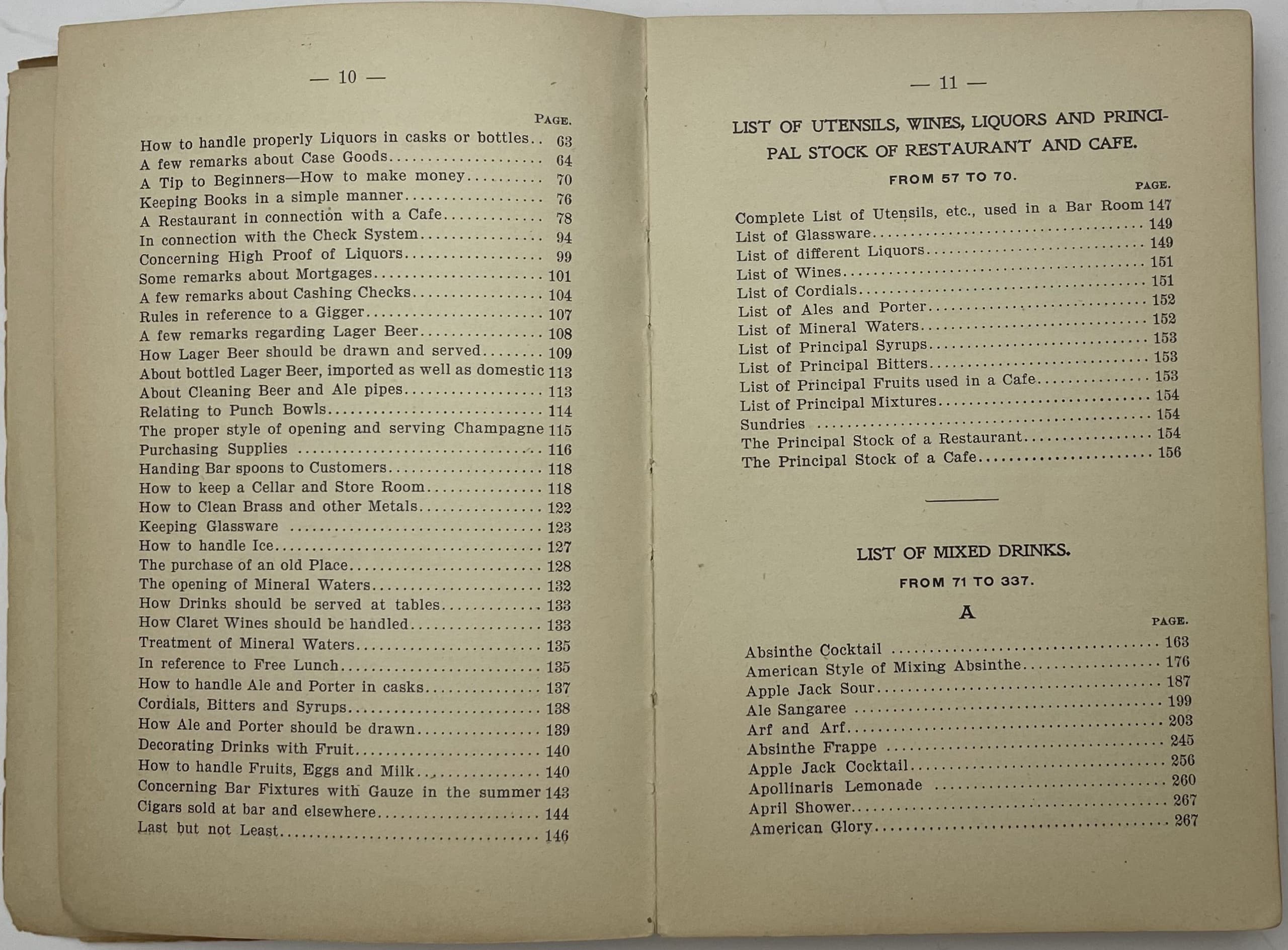 Containing valuable instructions and hints by the author in reference to the management of a bar, a hotel and a restaurant; also a large list of mixed drinks, including American, British, French, German, Italian, Russian, Sapnish, etc., with illustrations and a comprehensive description of bar utensils, wine, liquors, ales, mixtures, etc, etc