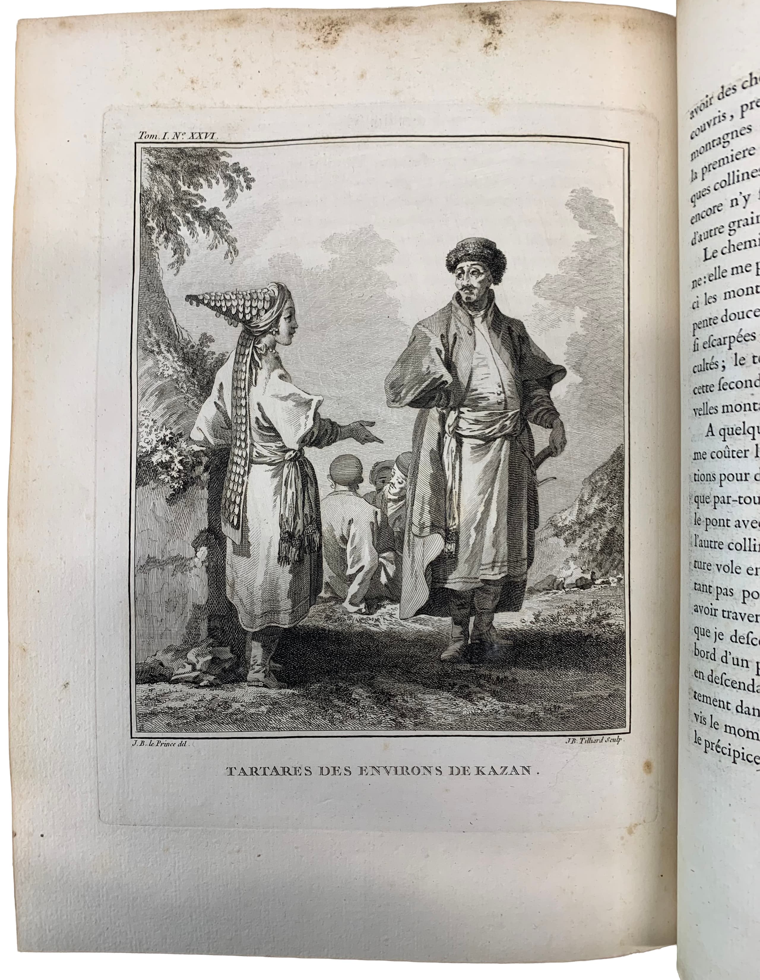 The illustrations are copperplate engravings after drawings by Jean-Baptiste Le Prince, who accompanied the scientist on his journey. In con-temporary full leather (morocco) bindings with rich gold embossing. Endpa-pers with ‘peacock feather’ pattern and engraved bookplates. In good con-dition. Some wear. The engraved bookplates depicting a griffin's head under a stylised Russian crown on the endpapers are the mark of ownership of Baron Thomas Dimsdale (1712–1800).