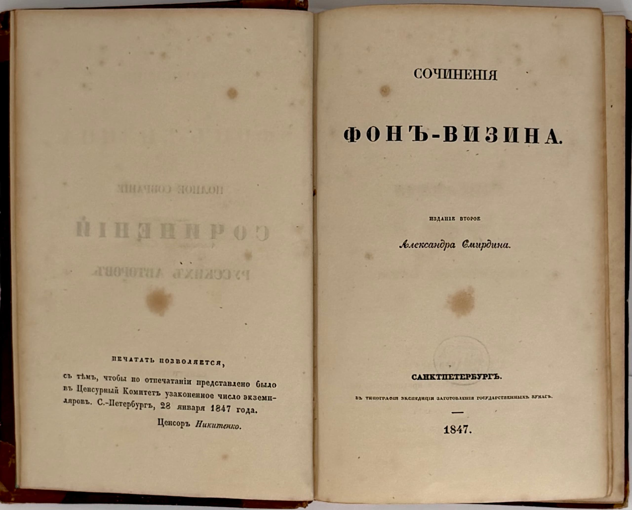 Sochineniya Fonvizina [Works of Fonvizin]: [in 2 vols.]. — 2nd ed. St Petersburg: printed by the Expedition for the Preparation of State Papers, 1847. — [4], 712, III pp.; 17.5 × 12.5 cm. — (Complete Works of Russian Authors).