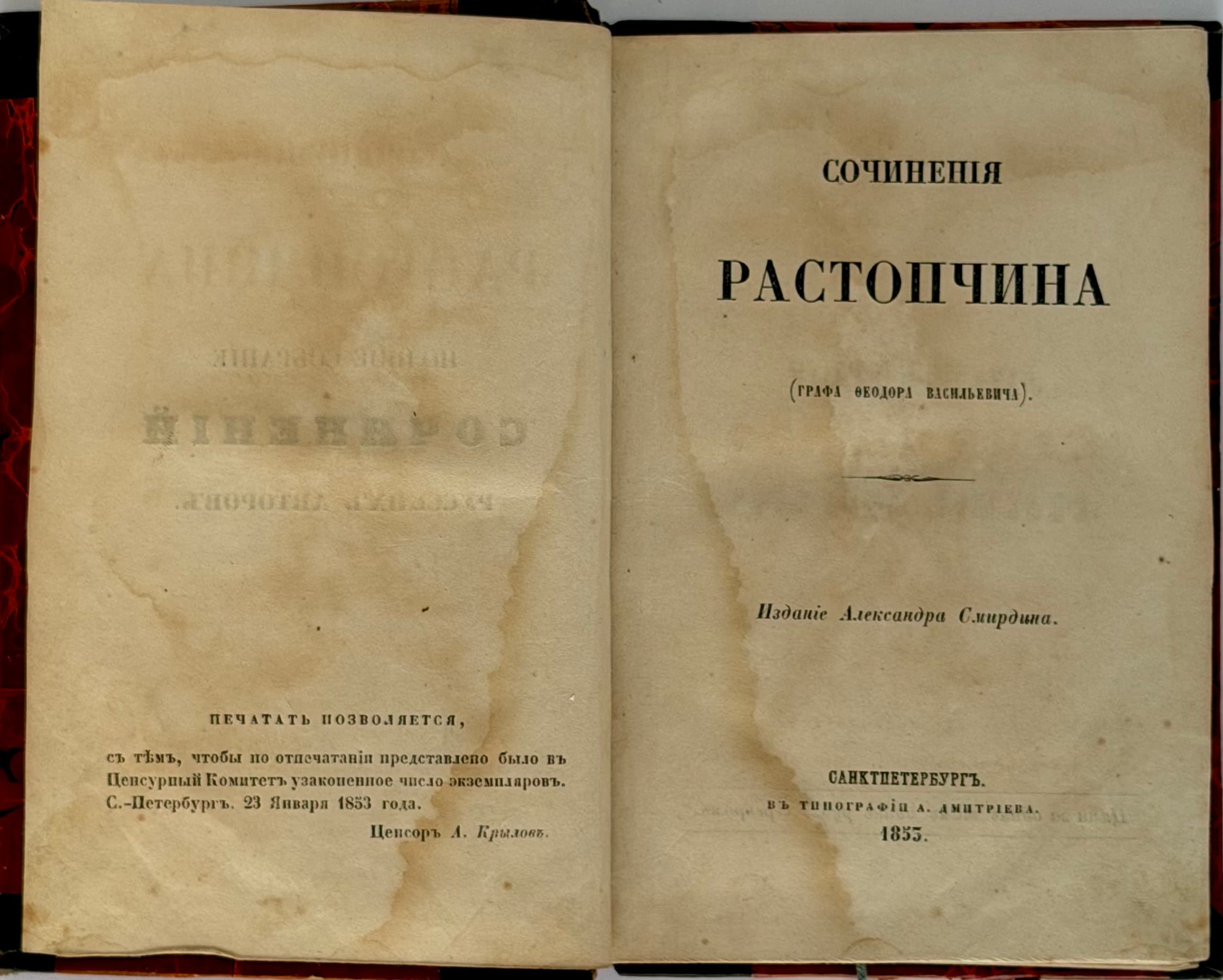 Sochineniya Rastopchina (grafa Feodora Vasil'evicha) [Works of Rostopchin]. St Petersburg: printed by A. Dmitriev, 1853. — 364, II pp.; 17.5 × 12 cm. — (Complete Works of Russian Authors).