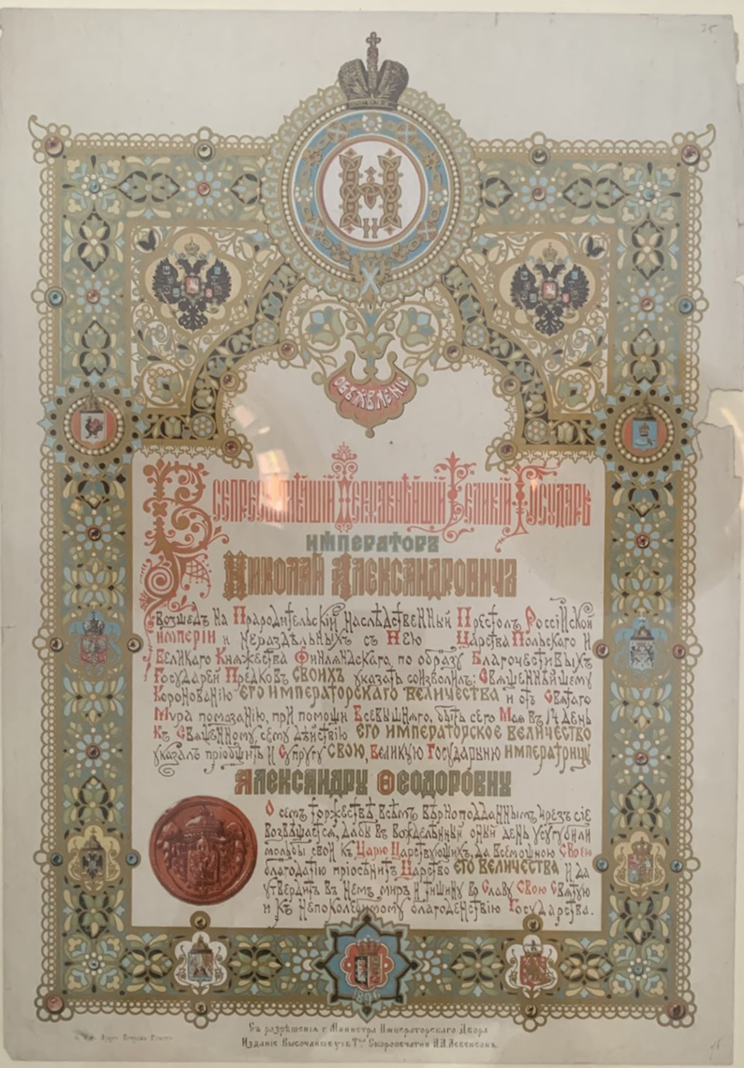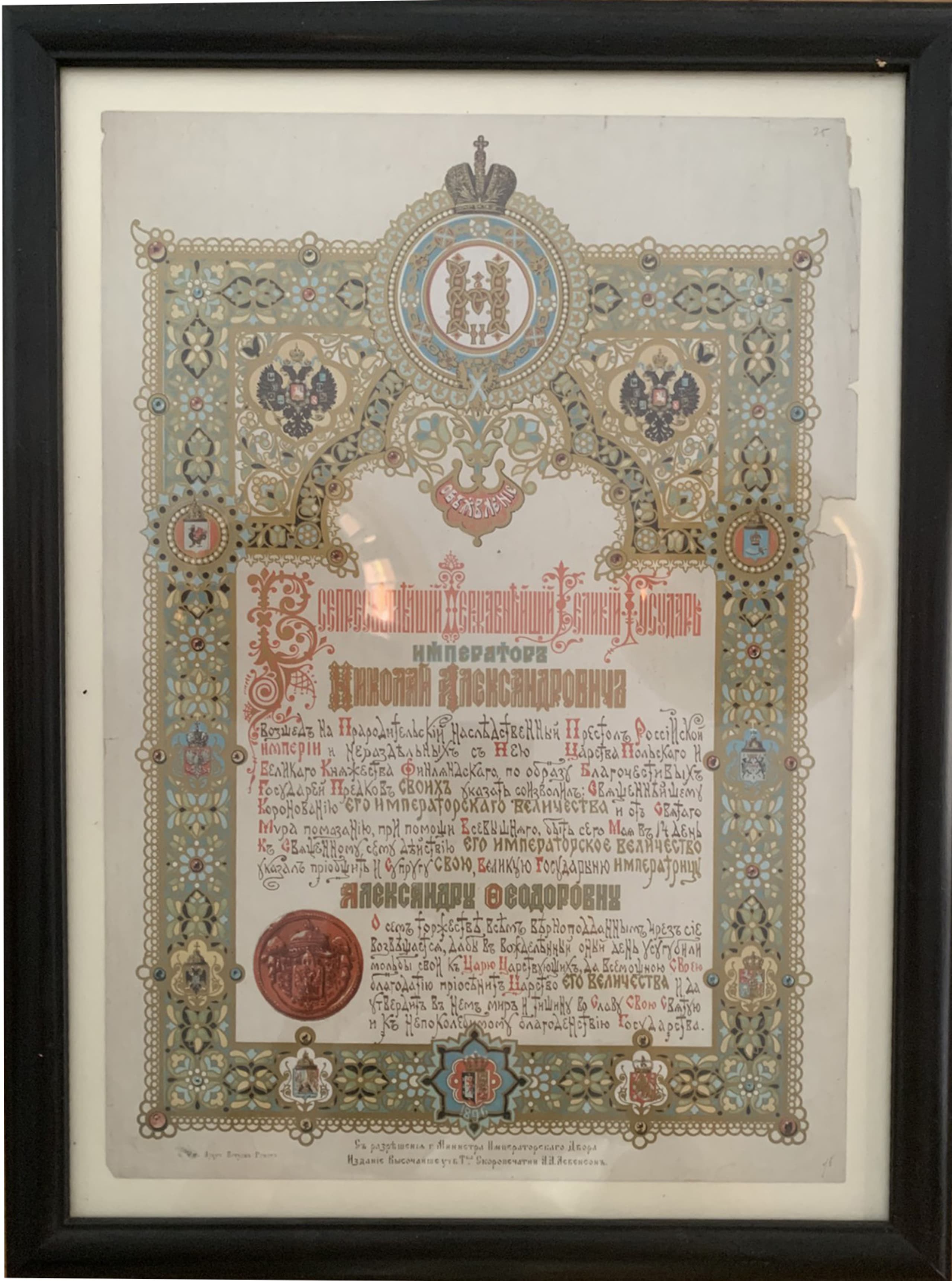 CORONATION OF NICHOLAS II AND ALEXANDRA FEDOROVNA (1896) Announcement of the coronation of Emperor Nicholas II and Empress Alexandra Feodorovna on May 14, 1896. Moscow: A.A. Levenson Printing Company, 1896