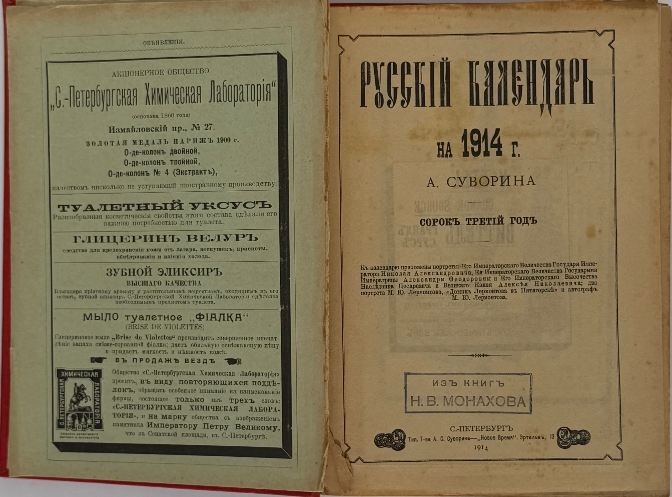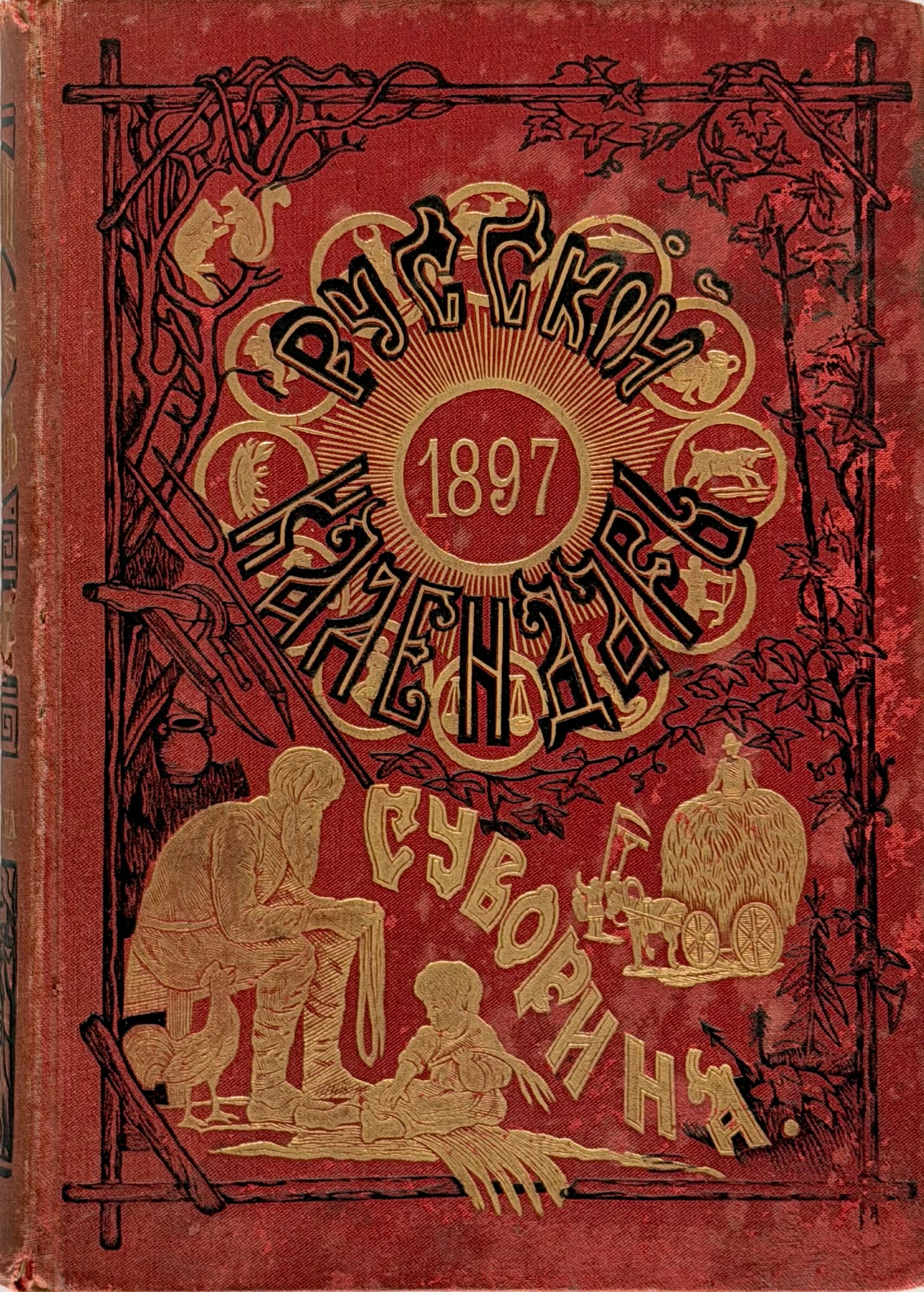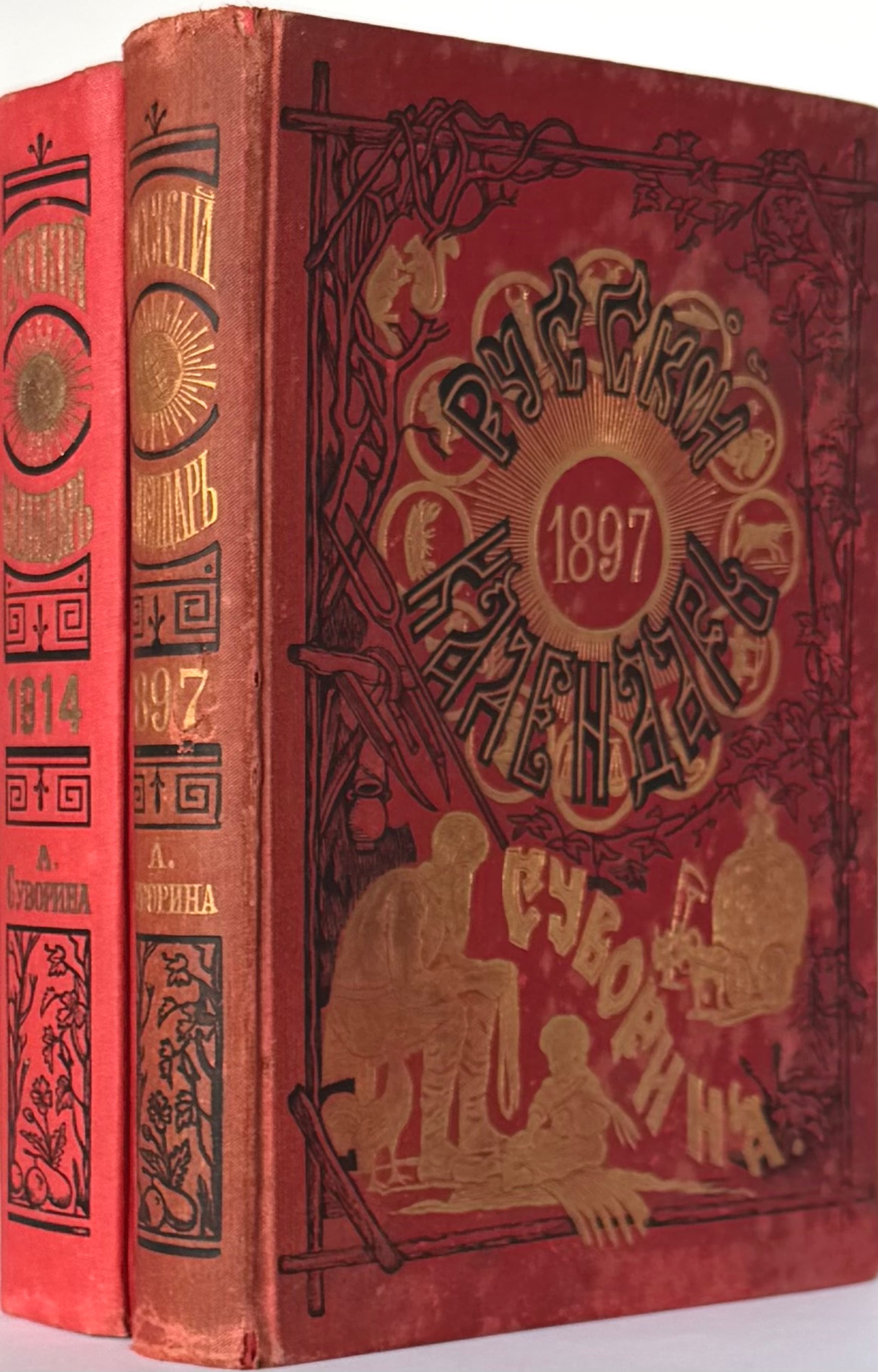 SUVORIN, A.S. 'RUSSKIY KALENDAR’, two editions 1) Na 1897 god: 26-y god ['For the year 1897: 26th year']. St Petersburg: A.S. Suvorin Press, 1897 2) Na 1914 god: 43-y god ['For the year 1914: 43rd year']. St Petersburg; Moscow: A.S. Suvorin Press, 1914