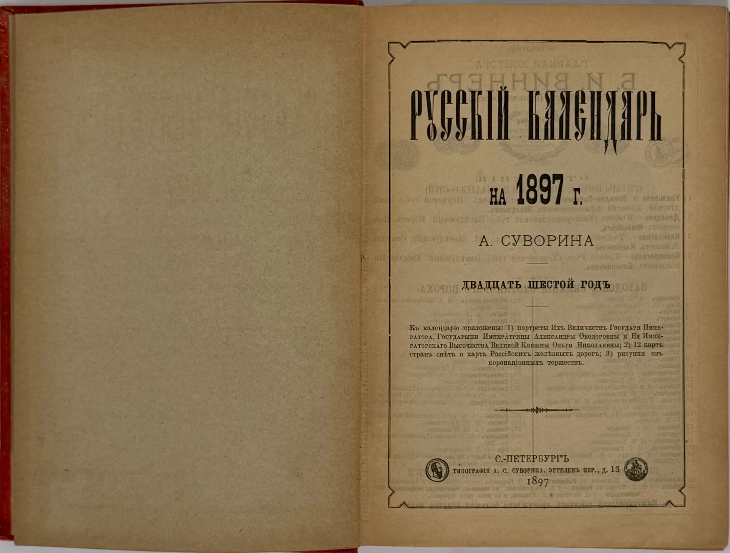 'Russkiy kalendar’ published by A. Suvorin appeared from 1872 onwards. It includes the Orthodox calendar, astronomical and meteorological data, statistical information on the Russian Empire, as well as finance, education, insurance, communications, credit, military affairs, and trade.