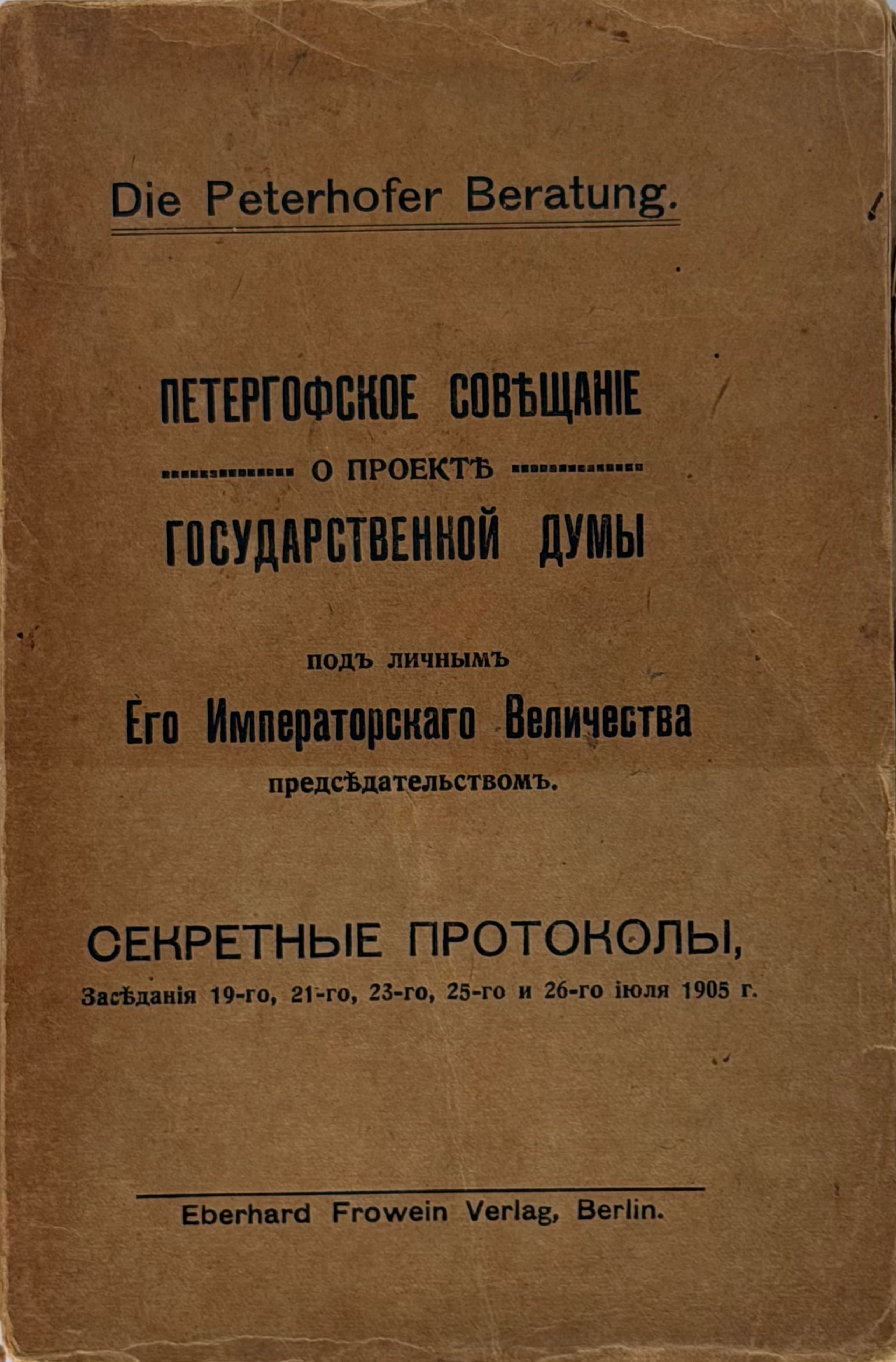 PETERGOFSKOE SOVESHCHANIE o proekte Gosudarstvennoy dumy pod lichnym ego imperatorskogo velichestva predsedatel’stvom: Sekretnye protokoly ['The Peterhof Conference on the Project of the State Duma under the Personal Chairmanship of His Imperial Majesty: Secret Protocols'] [sessions of 19, 21, 23, 25 and 26 July 1905]. Berlin: Eberhard Frowein Verlag, [1905?].