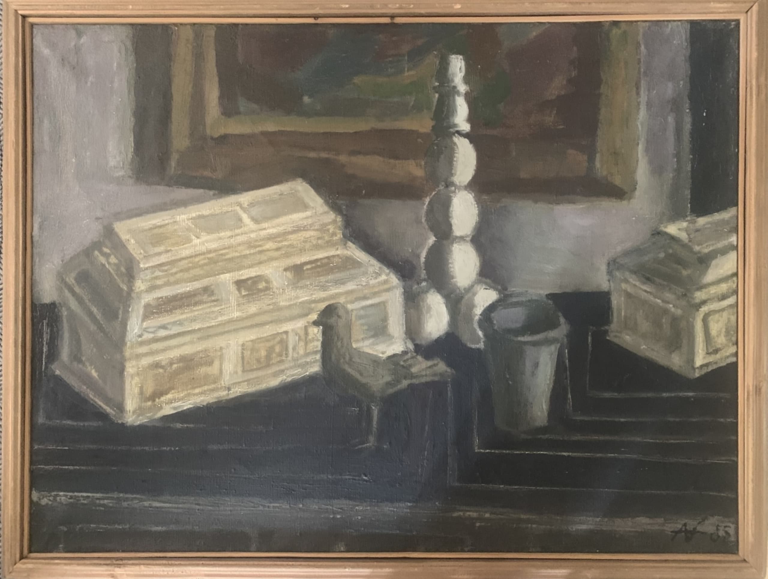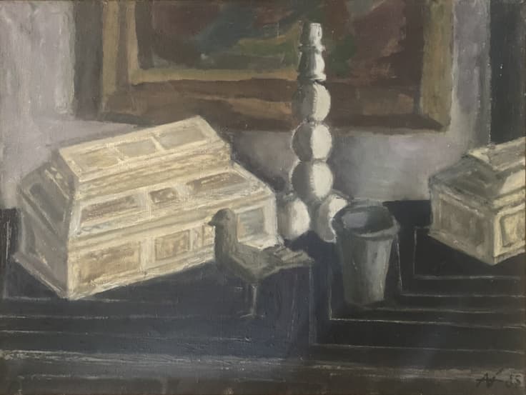 Dans les années 1970, Andronov s'est tourné vers des sujets plus introspectifs. Ses natures mortes et ses intérieurs de cette période révèlent un ton contemplatif, réfléchissant sur la forme, la mémoire et la présence durable du passé. Nature morte avec coffret de Kholmogory (1985) appartient à cette période de maturité.