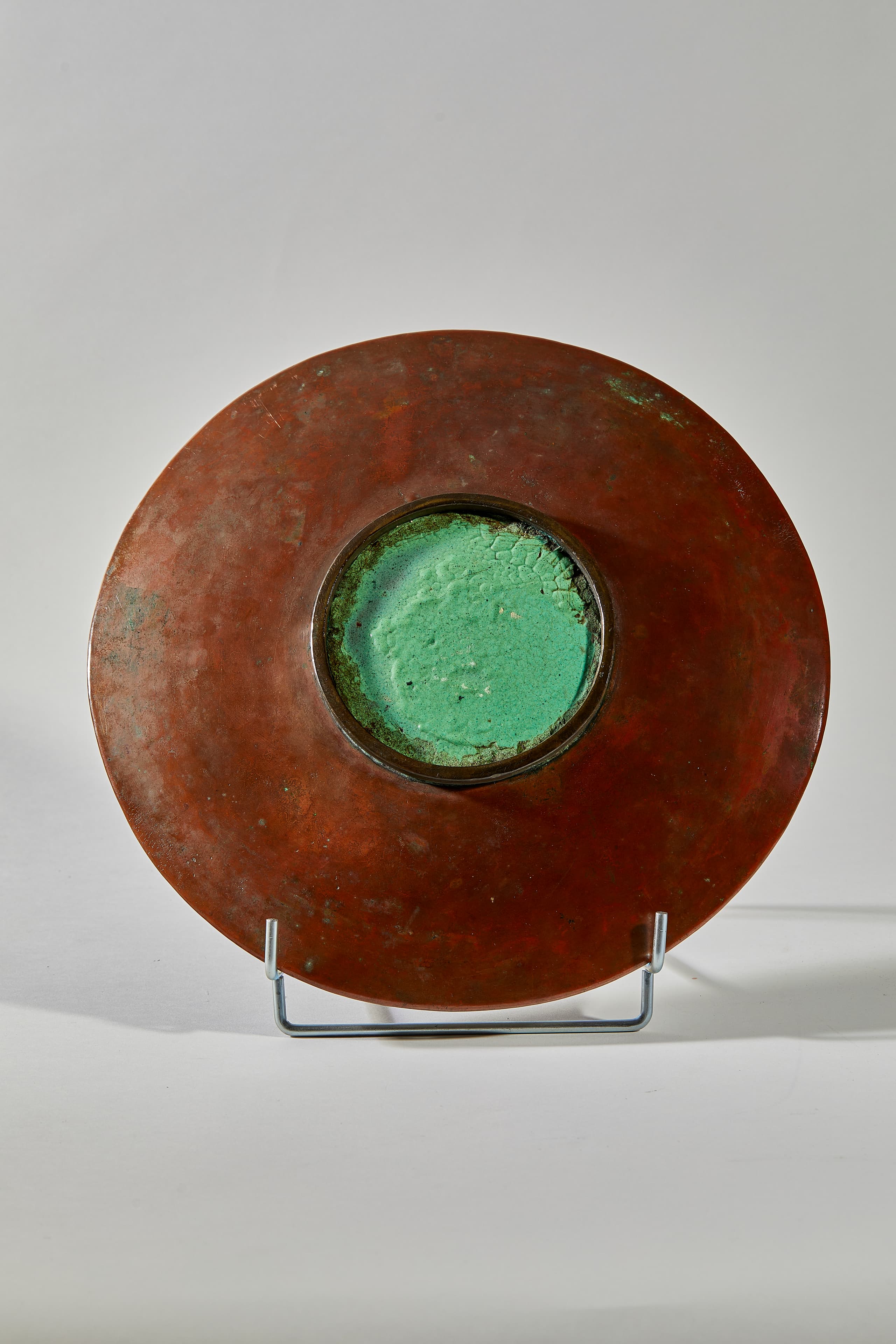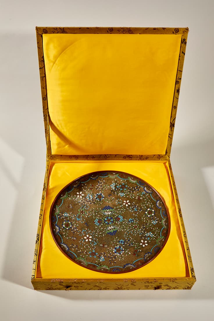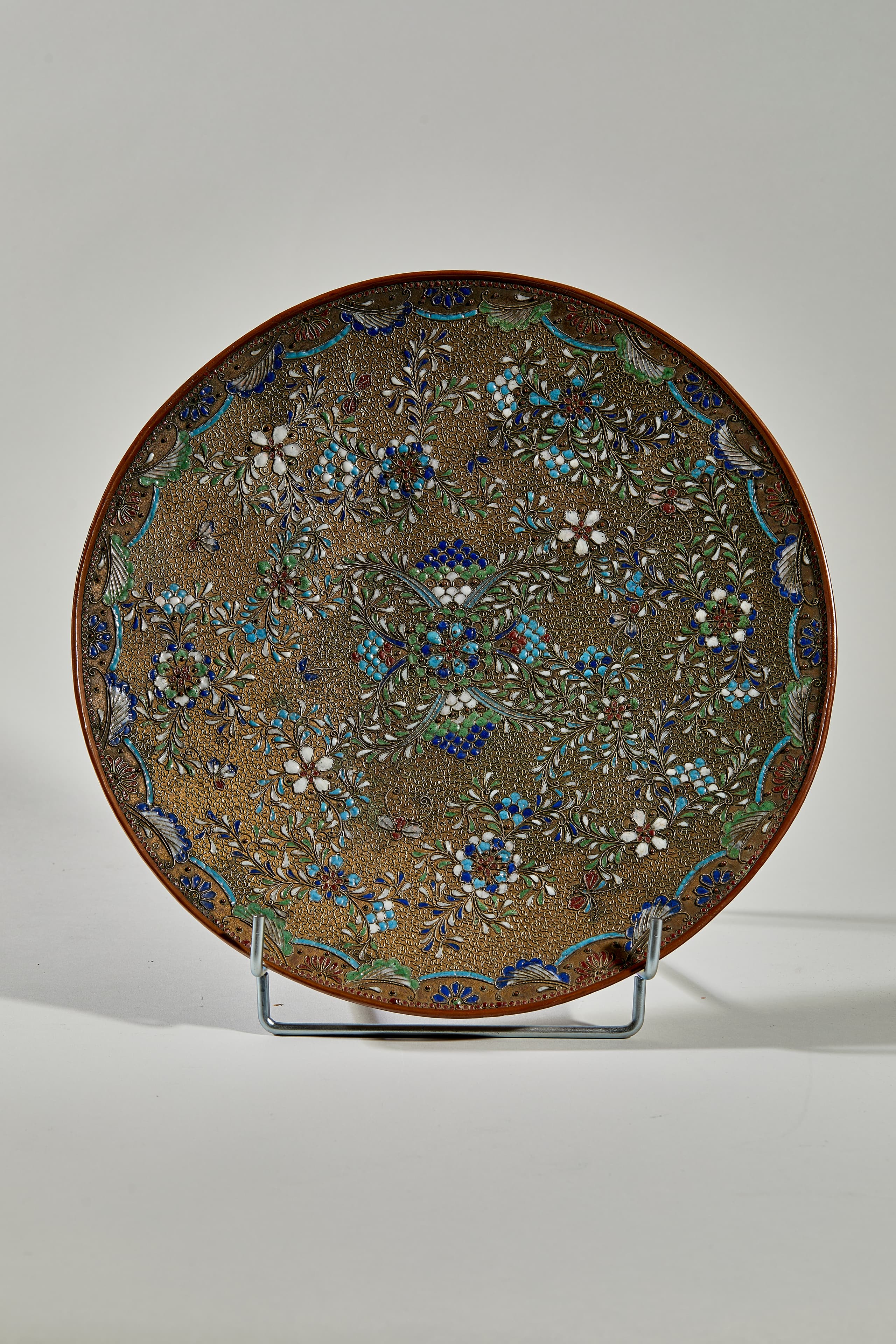 PLAT EN BRONZE ET ÉMAIL ORNÉE D’UN DÉCOR D’ARABESQUES ET DE FLEURS