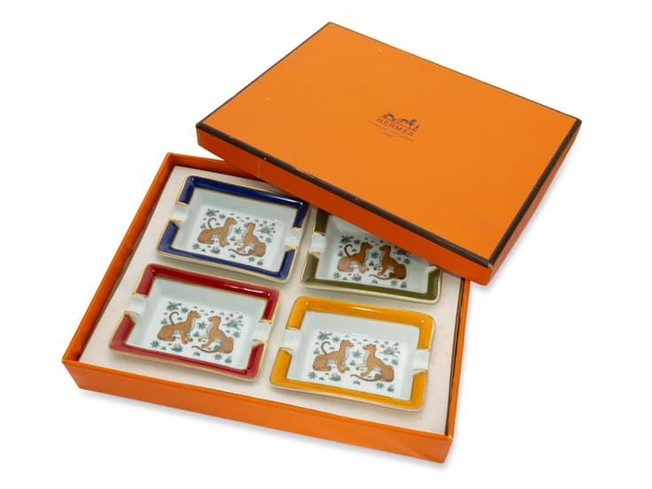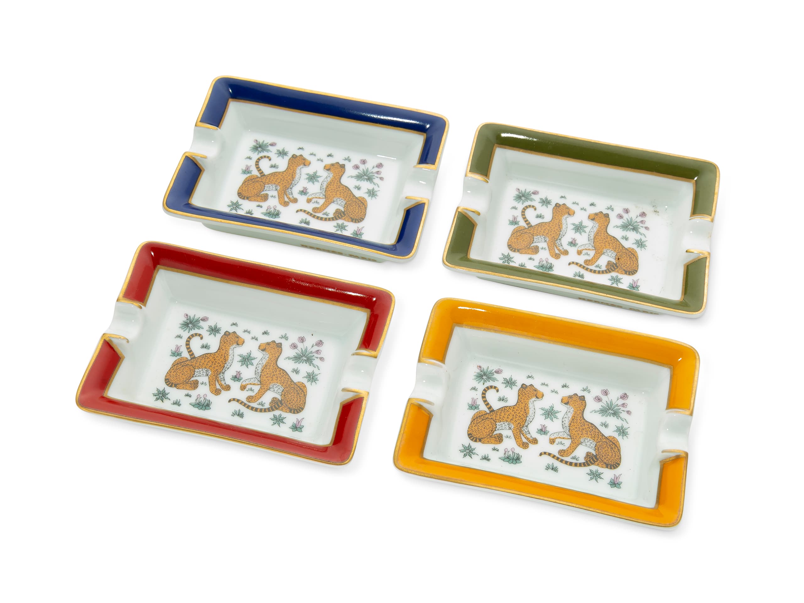 set de quatre cendriers Hermès en porcelaine française décorés de deux léopards et de fleurs