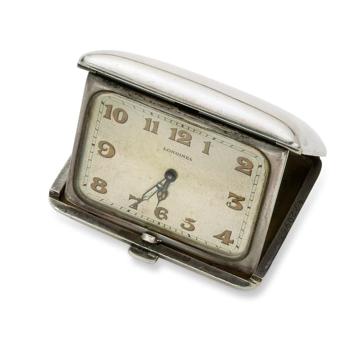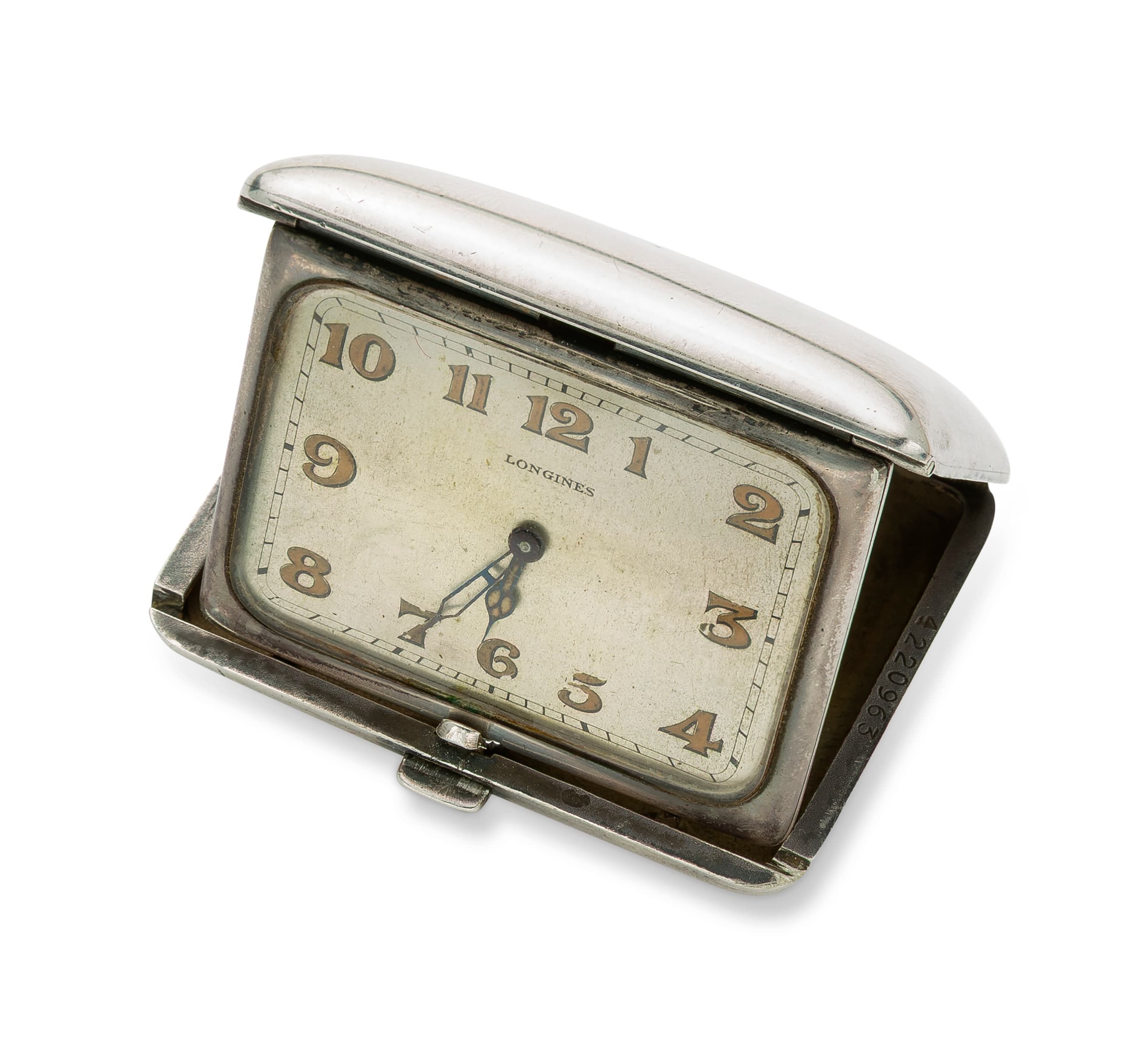 réveil de voyage pliant Longines en argent dont le couvercle est monogrammé ‘AE’
