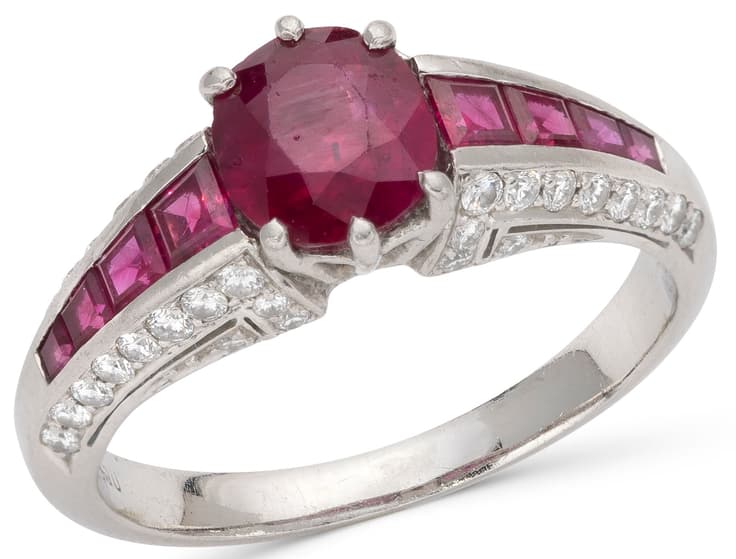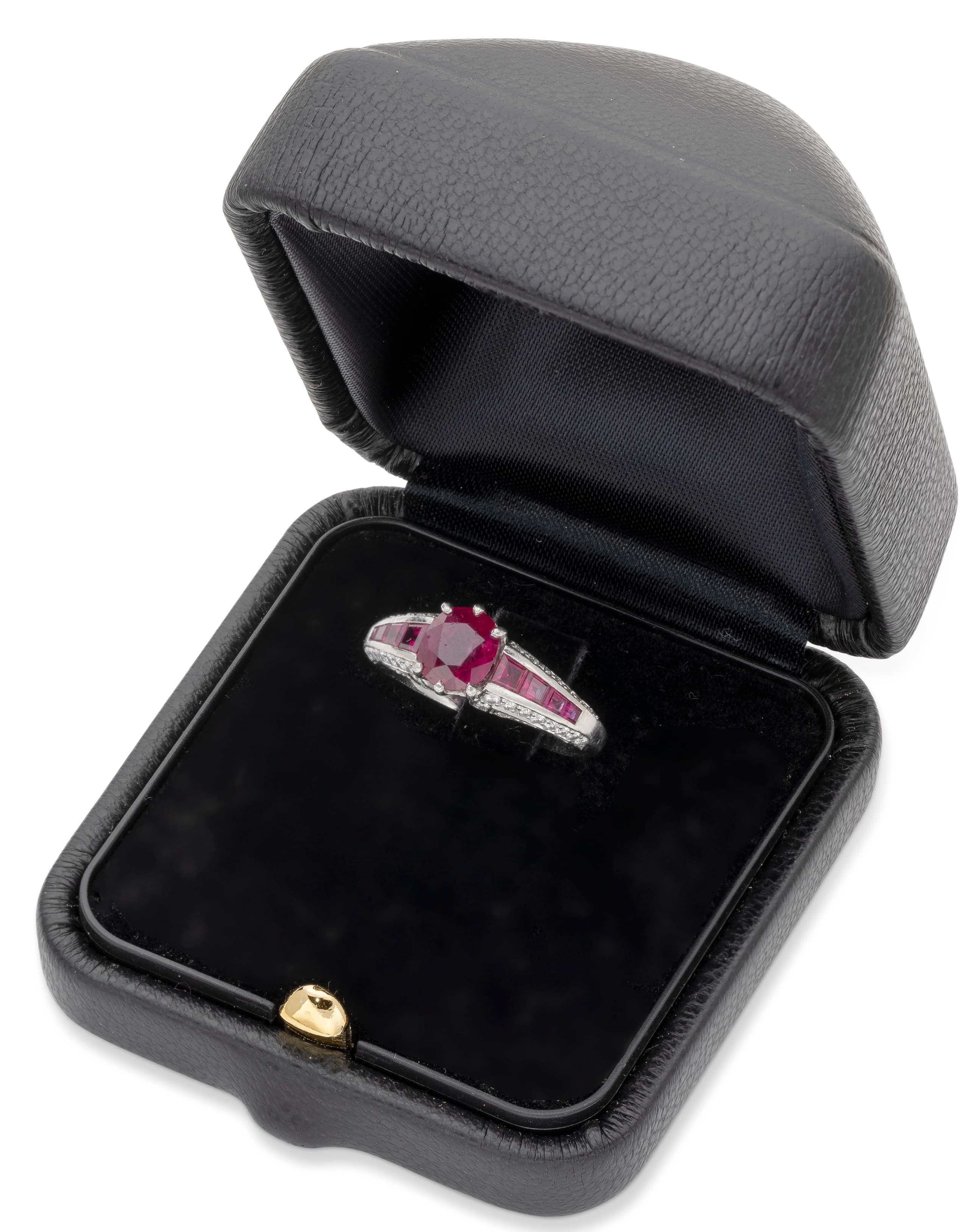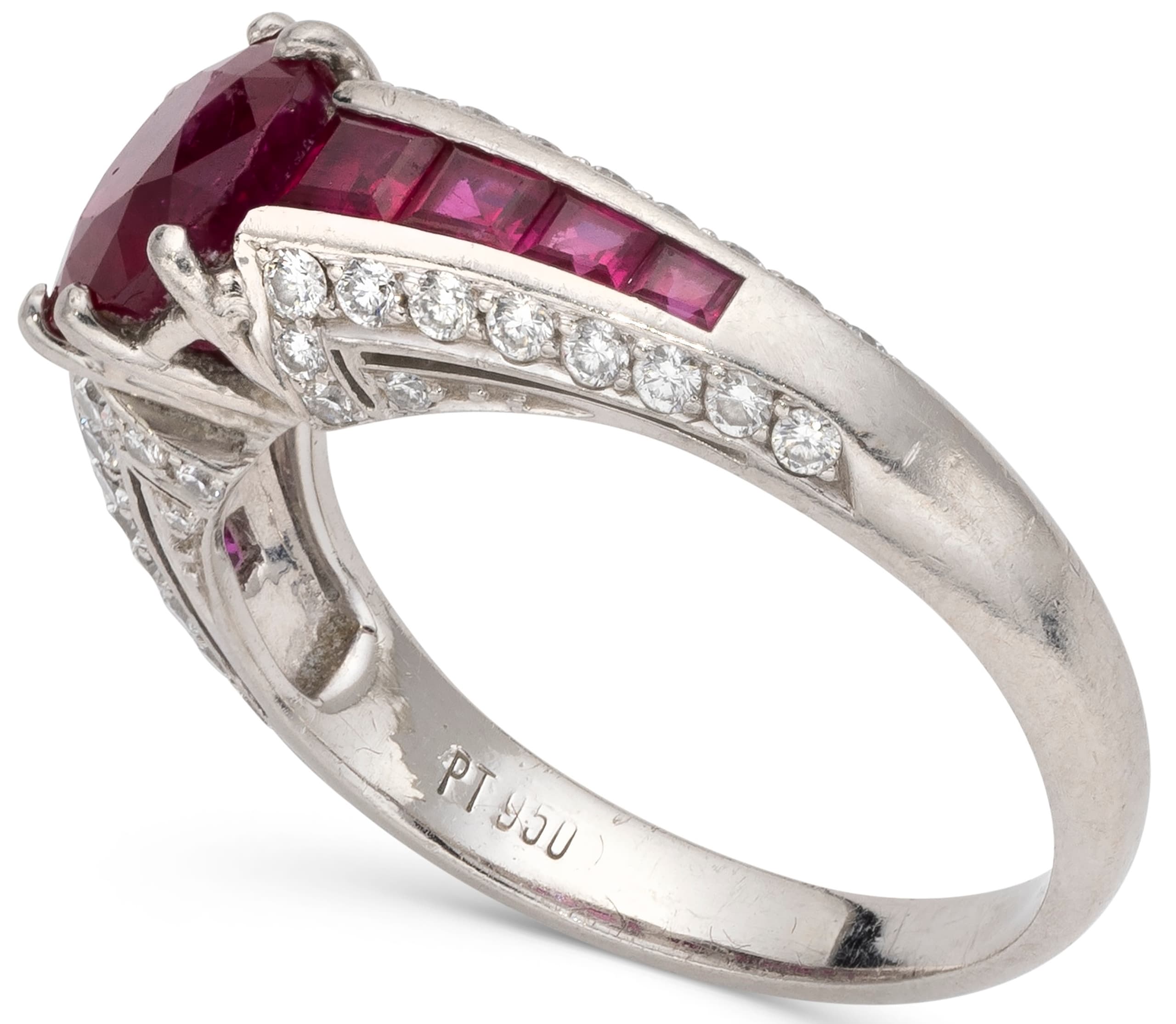 bague en platine serti d’un rubis birman taille coussin pesant 1,7 ct. épaulé de rubis calibrés pesant environ 0,50 ct. dans un entourage de diamants taille brillant pesant environ 0,80 ct.