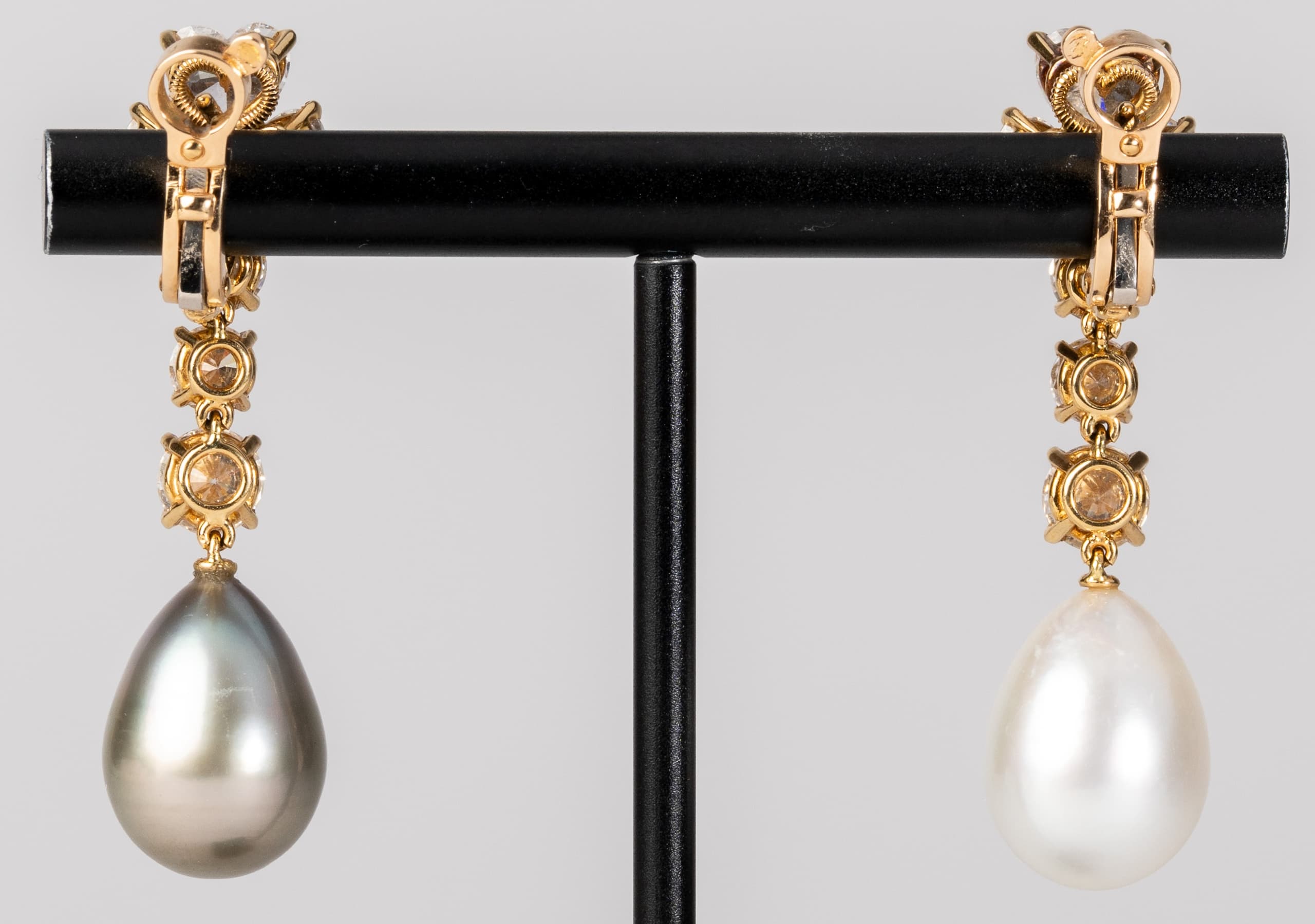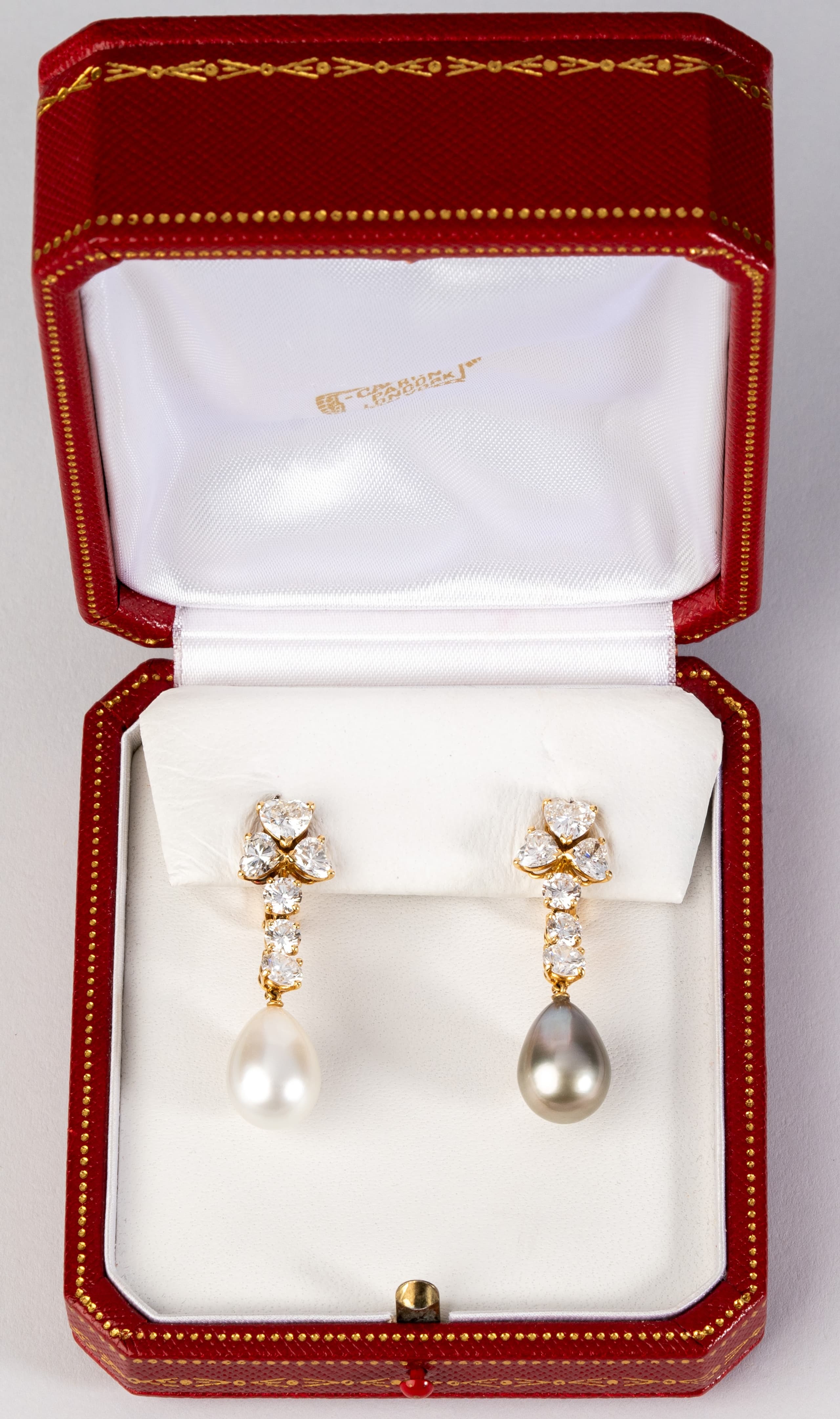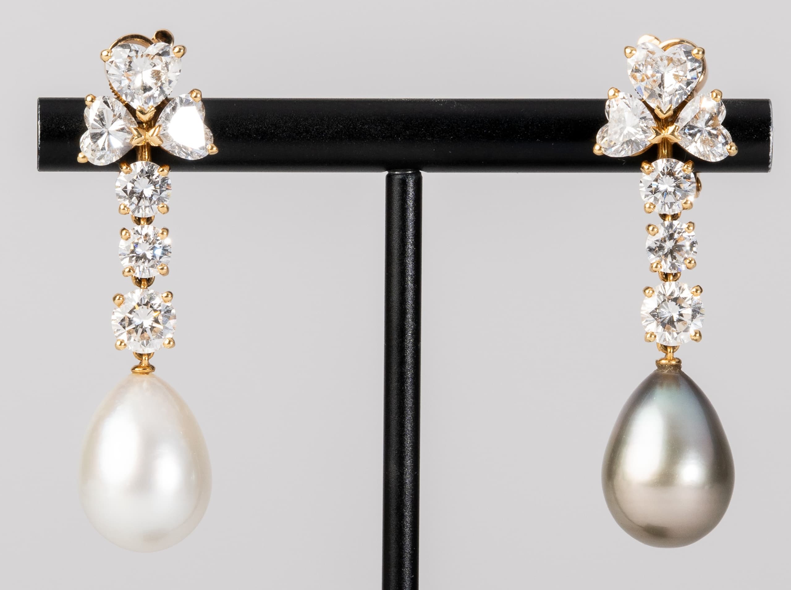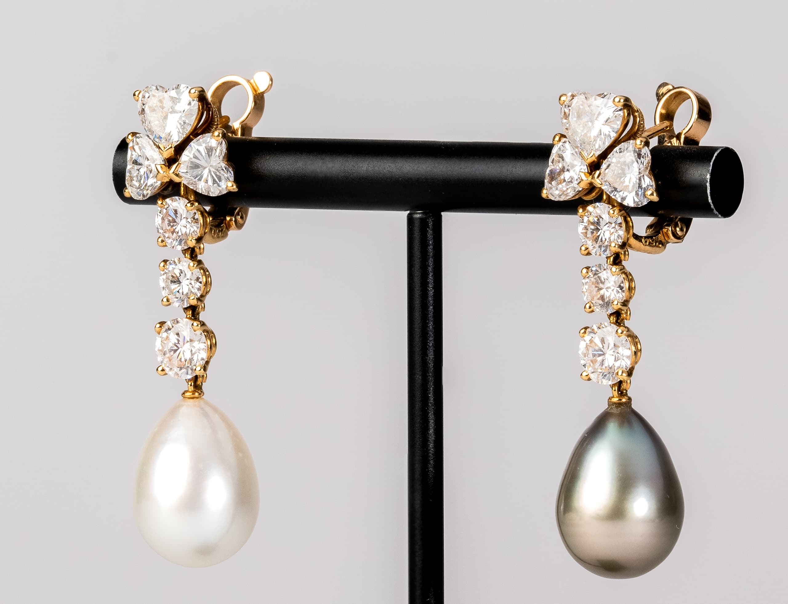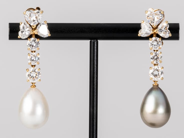 paire de boucles d’oreilles Cartier ‘Loli’ en or jaune 18k retenant deux perles de Tahitit pesant 23,33 ct., serties de diamants taille cœur pesant 3,23 ct. et de diamants taille brillant pesant 2,38 ct.