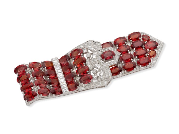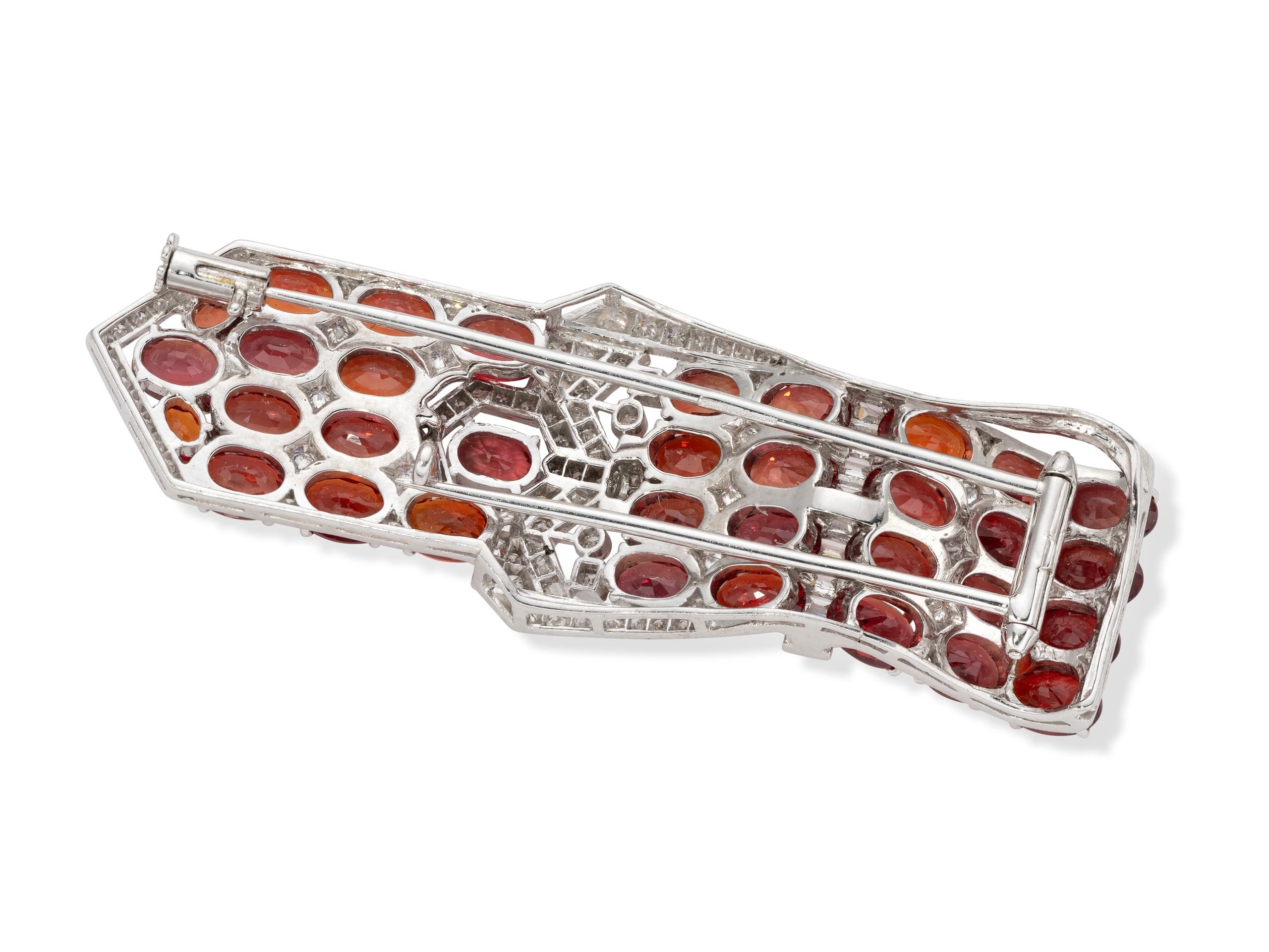 broche en or gris 18k en forme de boucle pavée de diamants taille brillant pesant environ 1,50 ct. et de saphirs oranges pesant environ 11 ct.