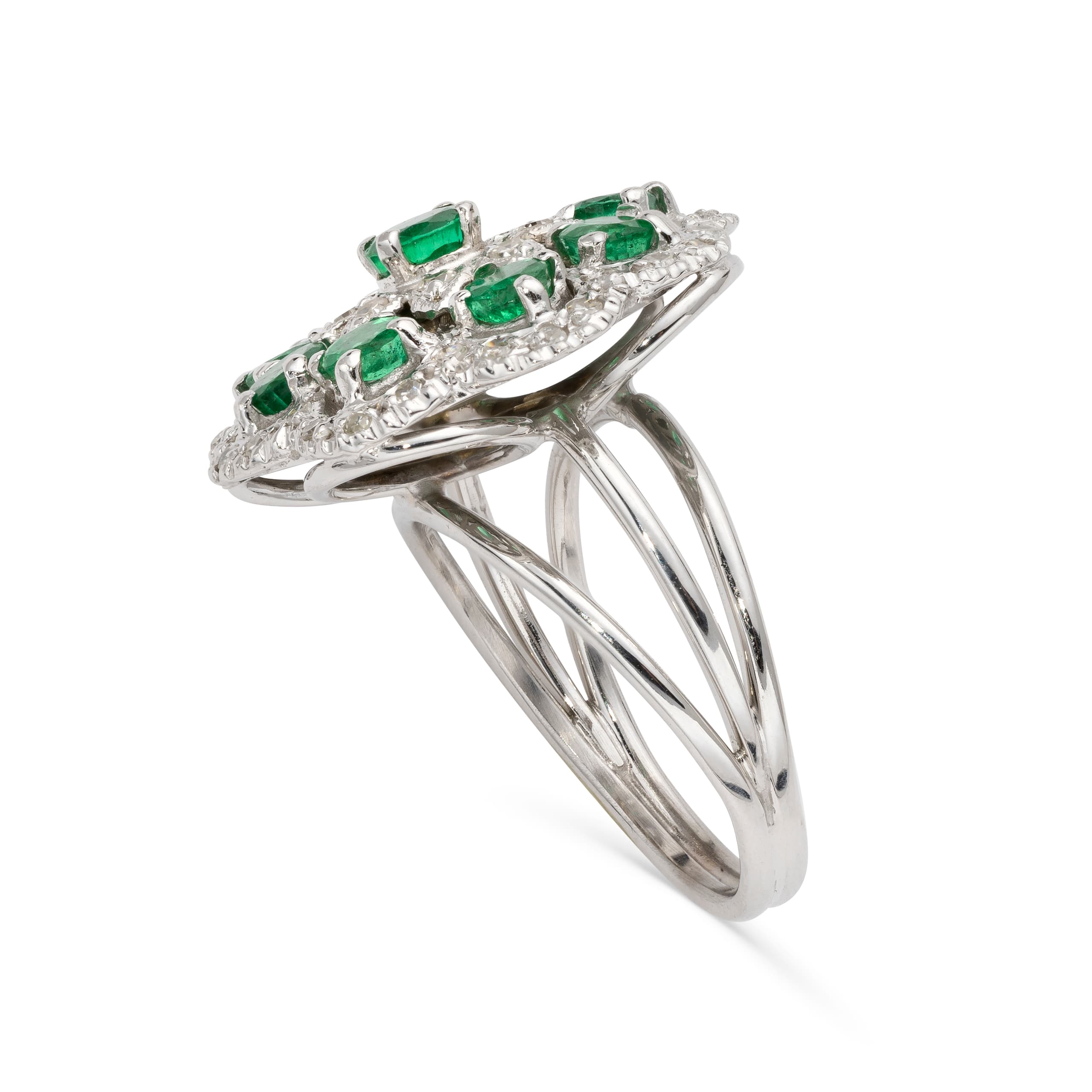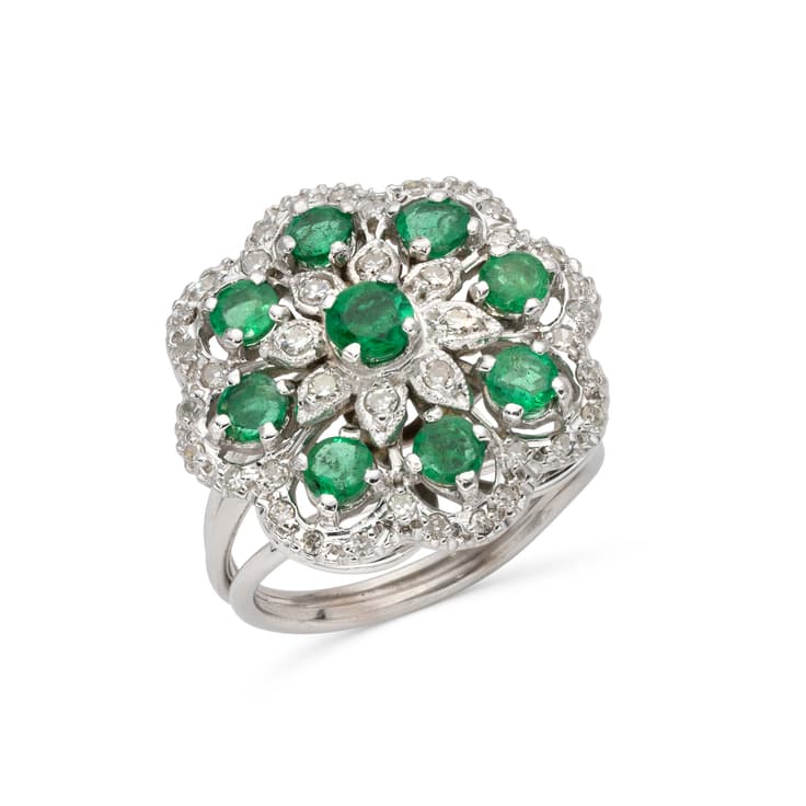 bague en or gris 18k figurant une fleur sertie de diamants taille brillant pesant environ 0,7 ct. et d’émeraudes pesant environ 1 ct.