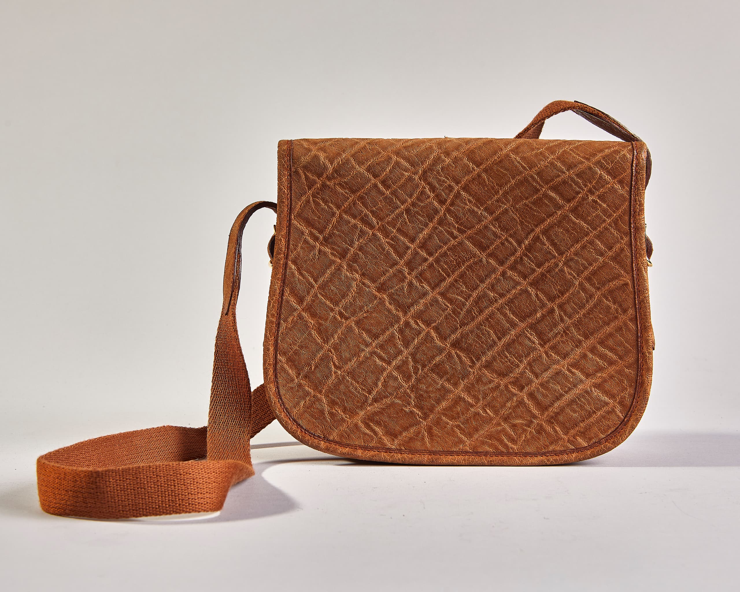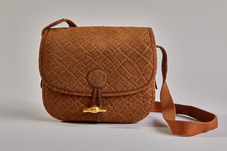 cuir d'éléphant camel embossé d'un motif diamant, fermoir bambou doré,
