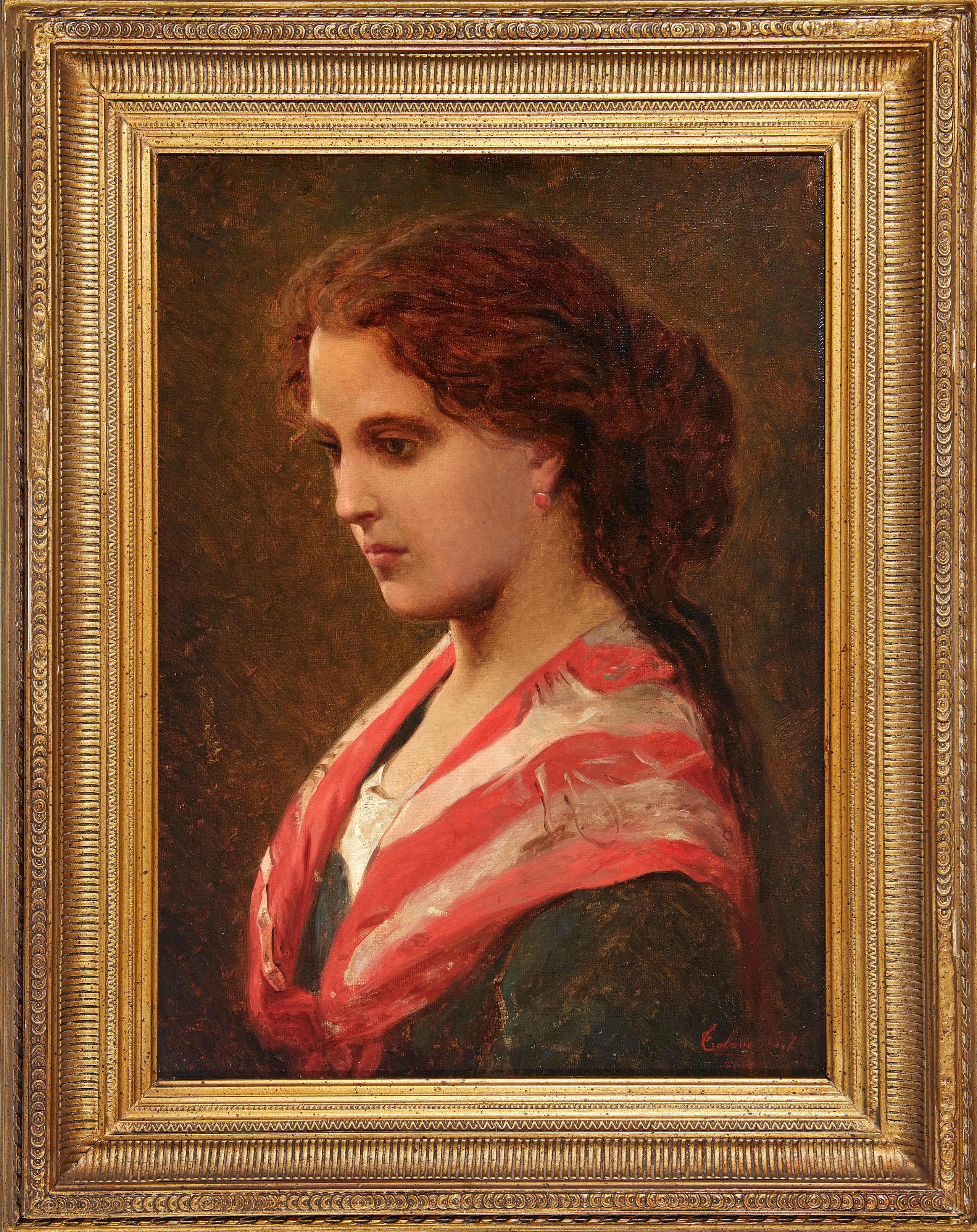 CESARE TALLONE (1853-1919) Portrait of a woman in a red and white scarf