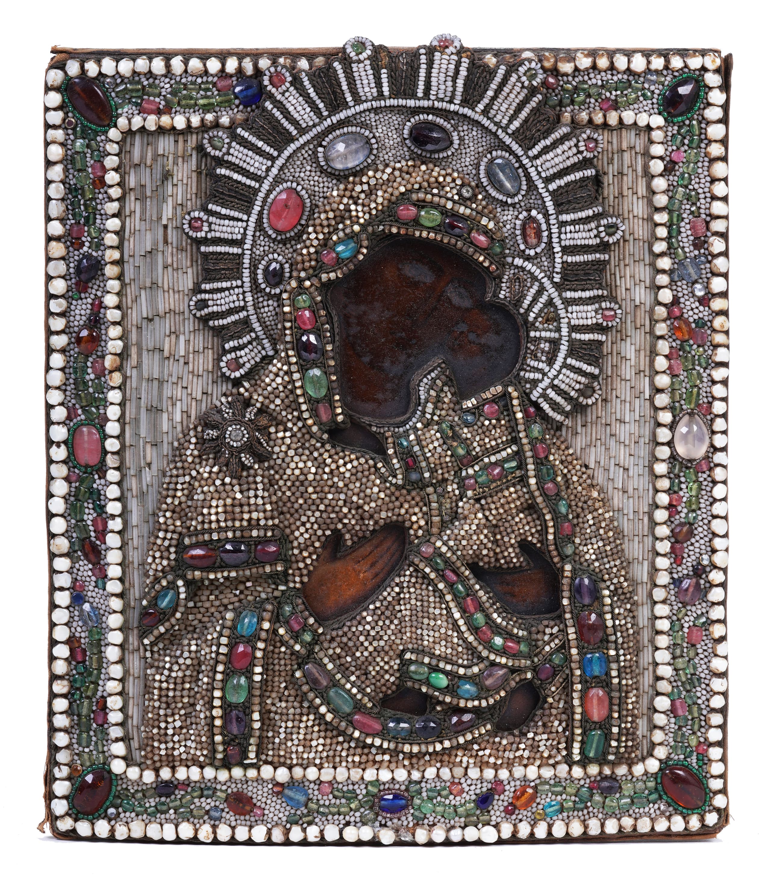 ICÔNE ‘VLADIMIRSKAYA MÈRE DE DIEU’ EN OKLAD AVEC BRODERIE Russie, seconde moitié du 19ème siècle