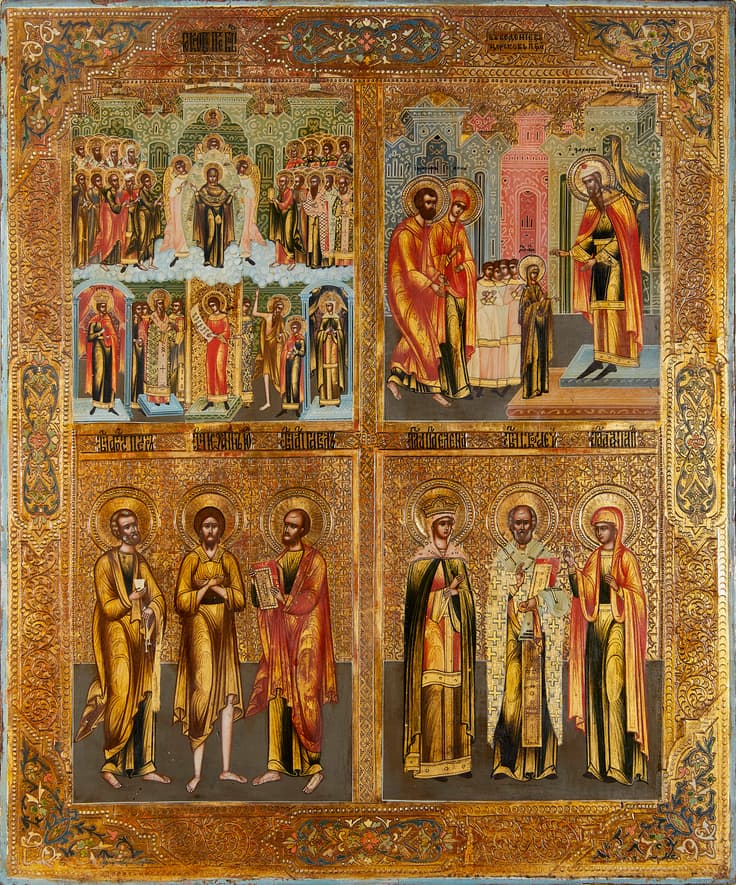 ICÔNE À QUATRE PARTIES ‘LE VOILE PROTECTEUR DE LA MÈRE DE DIEU’, ‘ENTRÉE AU TEMPLE DE LA MÈRE DE DIEU’, ‘SAINTS PIERRE, JEAN DE MOSCOU ET PAUL’, ‘SAINTS HÉLÈNE, NICHOLAS ET ANNA’