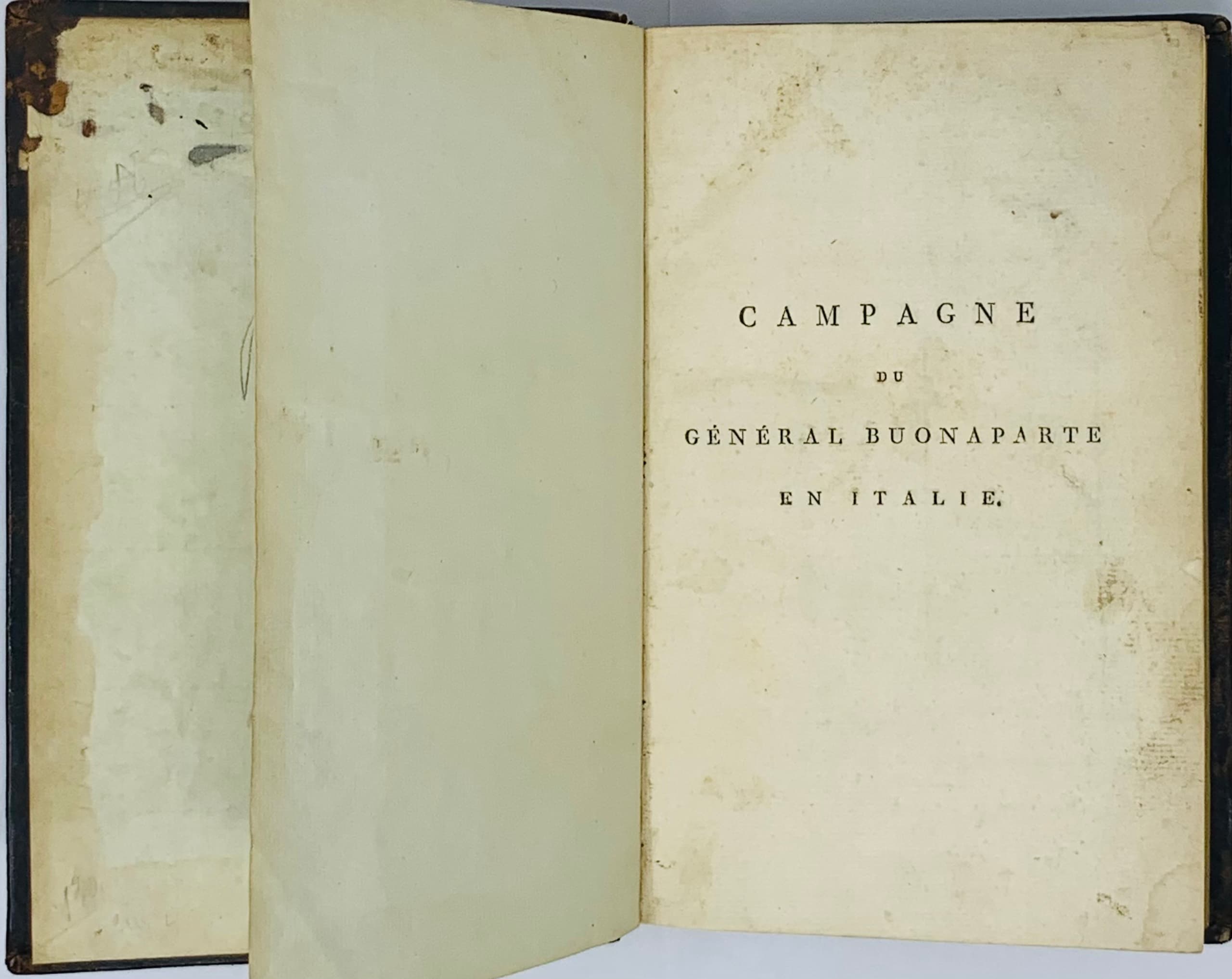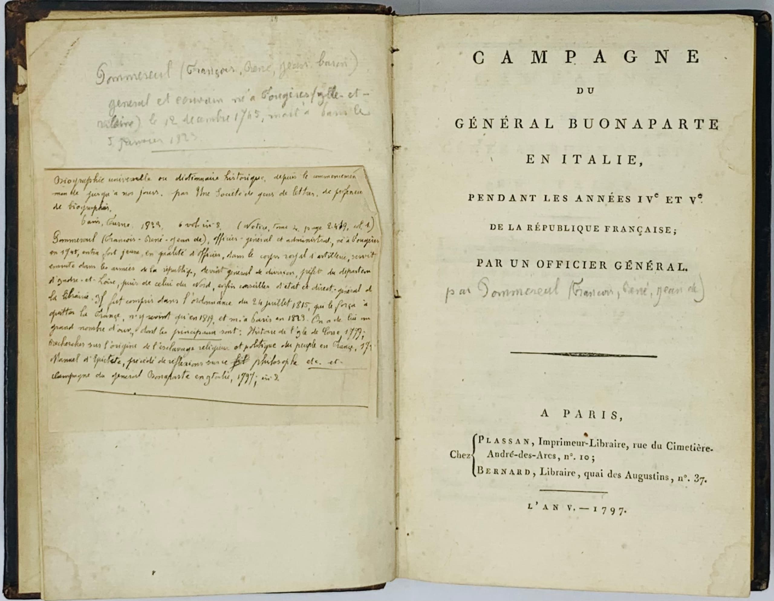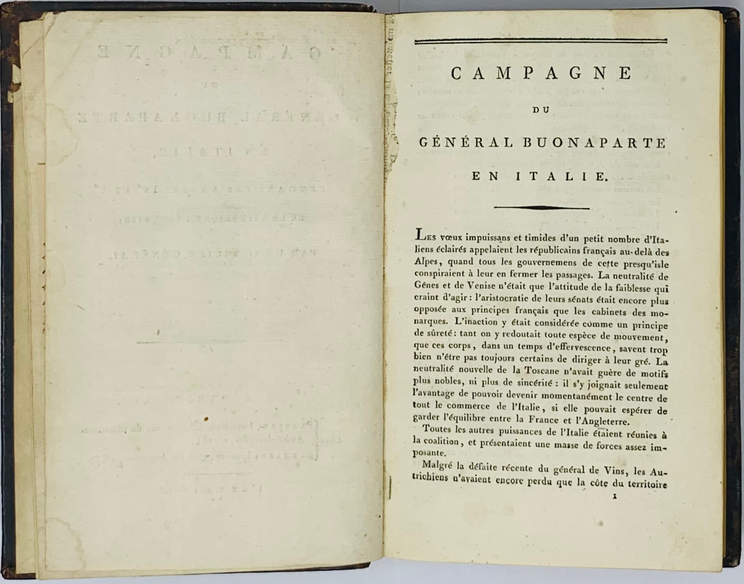 Campagne du général Buonaparte en Italie, pendant les années IV-e et V-e de la République française, par un officier général. Paris: Chez Bernard, Libraire, Quai des Augustins, L’an V, 1797.