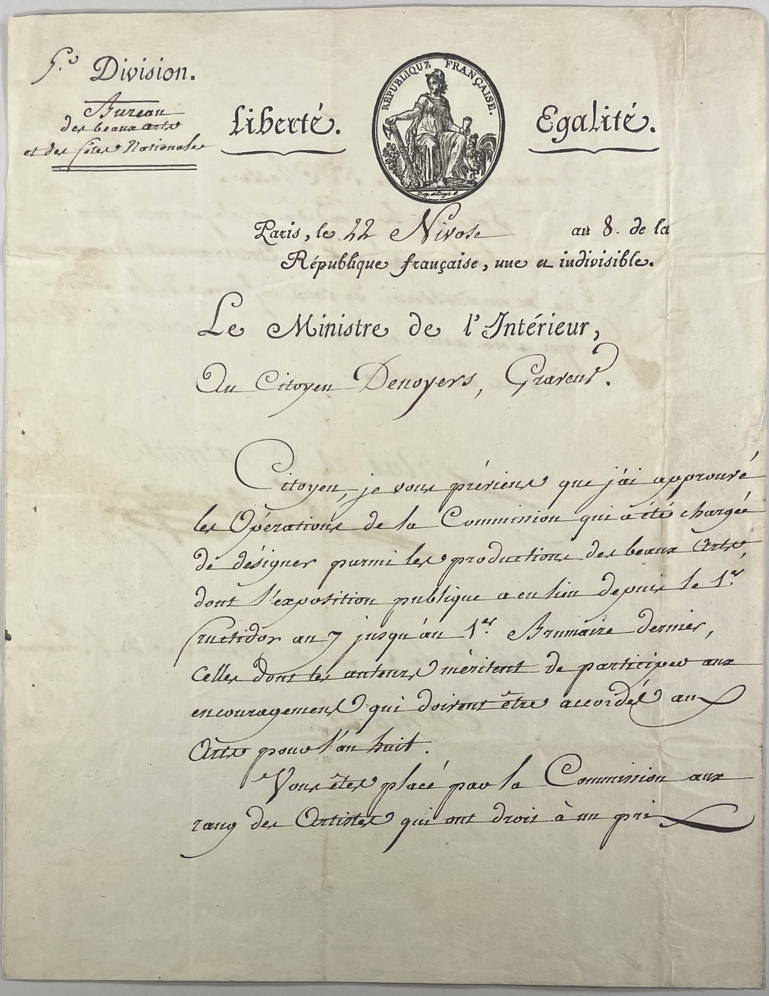 Il l'informe qu'il a approuvé les opérations de la commission chargée de désigner les meilleurs artistes de l'exposition qui a eu lieu 'du 1er fructidor an VII [18 Août 1799] jusqu'au 1er brumaire dernier [23 Octobre 1799] '… Il a eu droit à 'un prix d'encouragement de 3ème classe'. Dès que les fonds auront été fixés, il l'informera de la somme qui lui aura été accordée… 'Salut et fraternité'