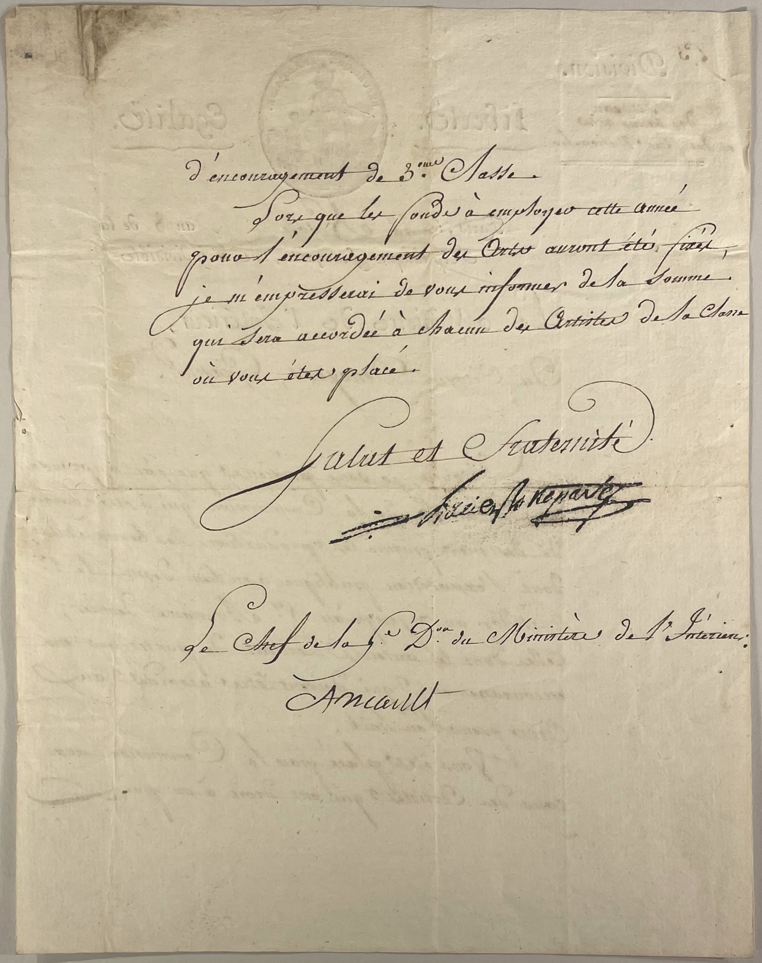 Lettre signée en tant que Ministre de l'Intérieur, poste qu'il occupa 10 mois, et contresignée par Antoine Vincent Arnault, alors chef de la 4ème division du Ministère de l'Intérieur, mais aussi poète et auteur dramatique.