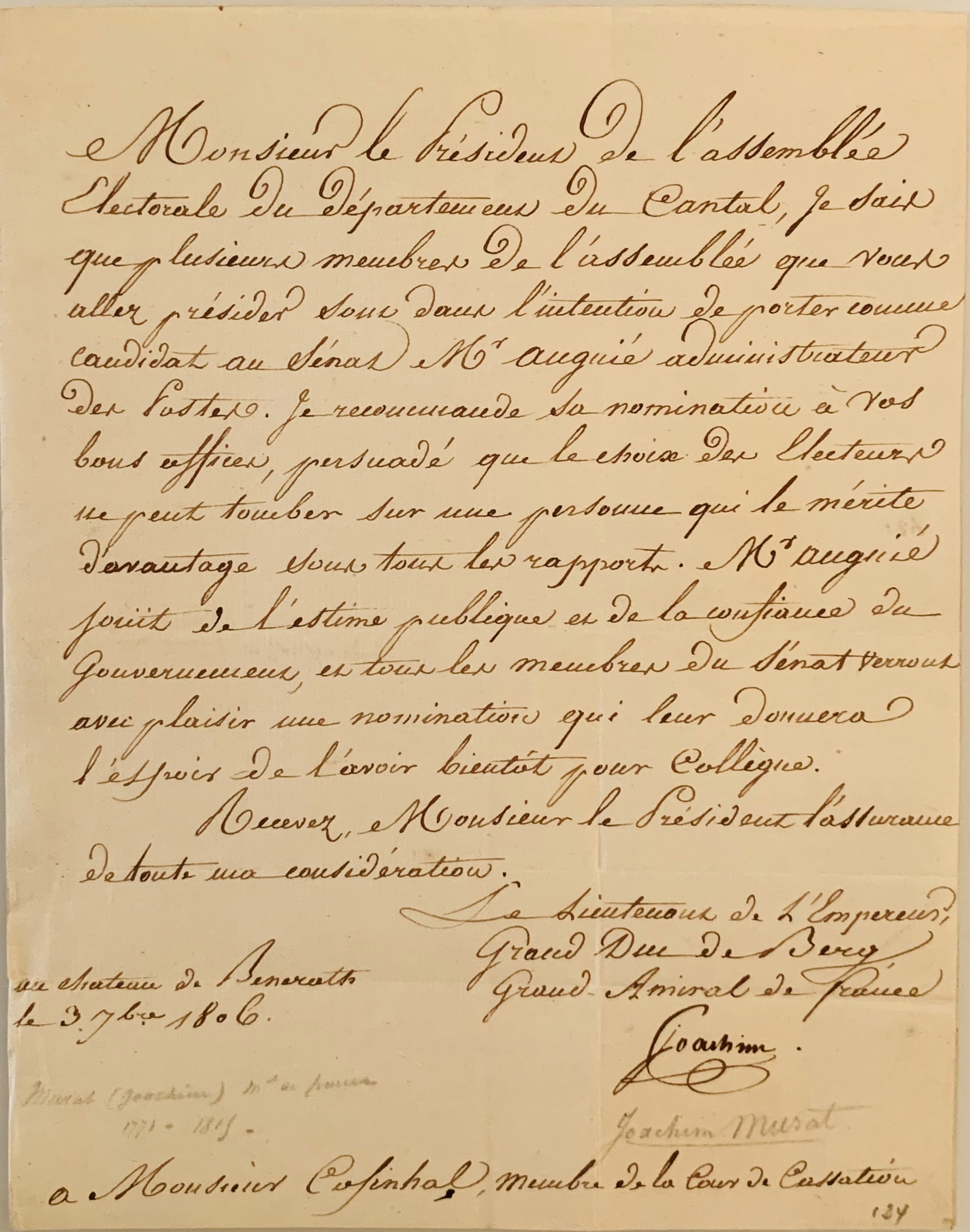Lettre de Murat en qualité de ' lieutenant de l’Empereur ' soutenant au-près du Président de l’assemblée électorale du département du Cantal, la candidature de M. Auguié, administrateur des Postes pour le Sénat ; (…) Je recommande sa nomination à vos bons offices, persuadé que le choix des électeurs ne peut tomber sur une personne qui le mérite davantage (…). Mr Auguié jouit de l’estime publique et de la confiance du Gouvernement, et tous les membres du Sénat verront avec plaisir (sa) nomination (…).