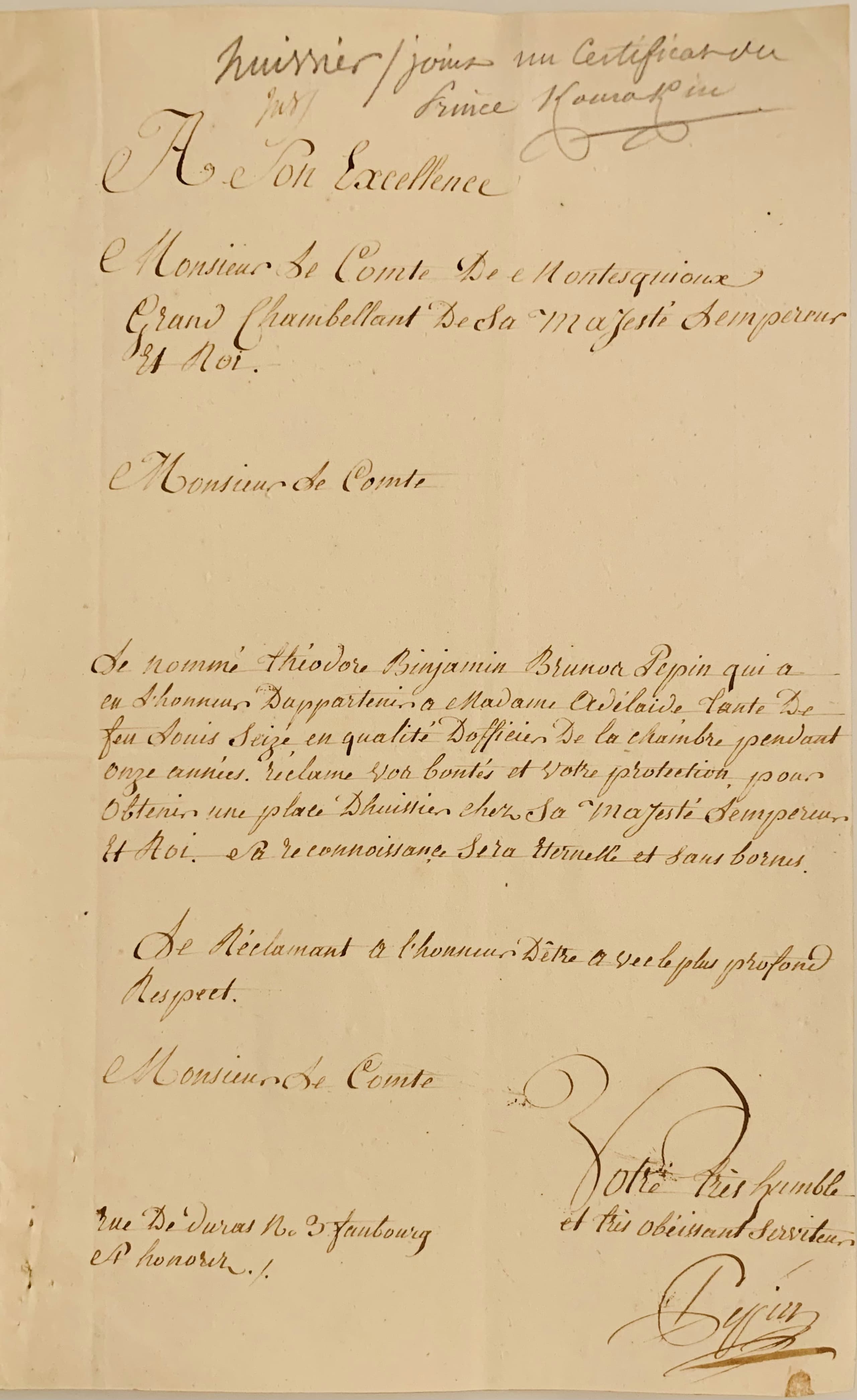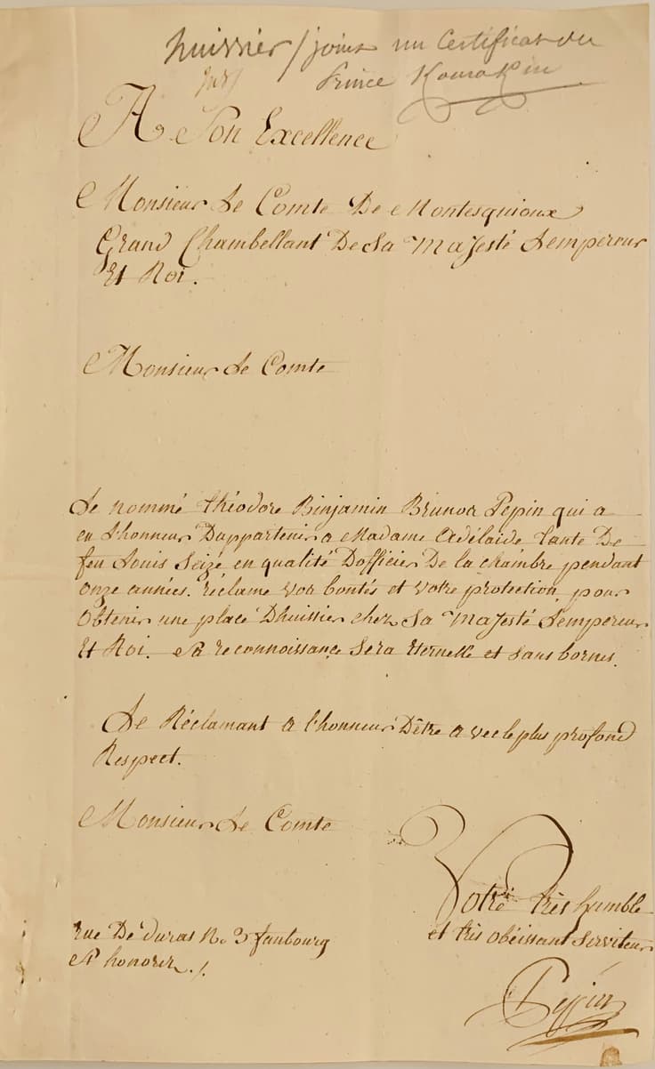 Certificat délivré à Théodore Pépin, qui a servi le prince pendant onze mois. Paris, 24 novembre, 1809.
