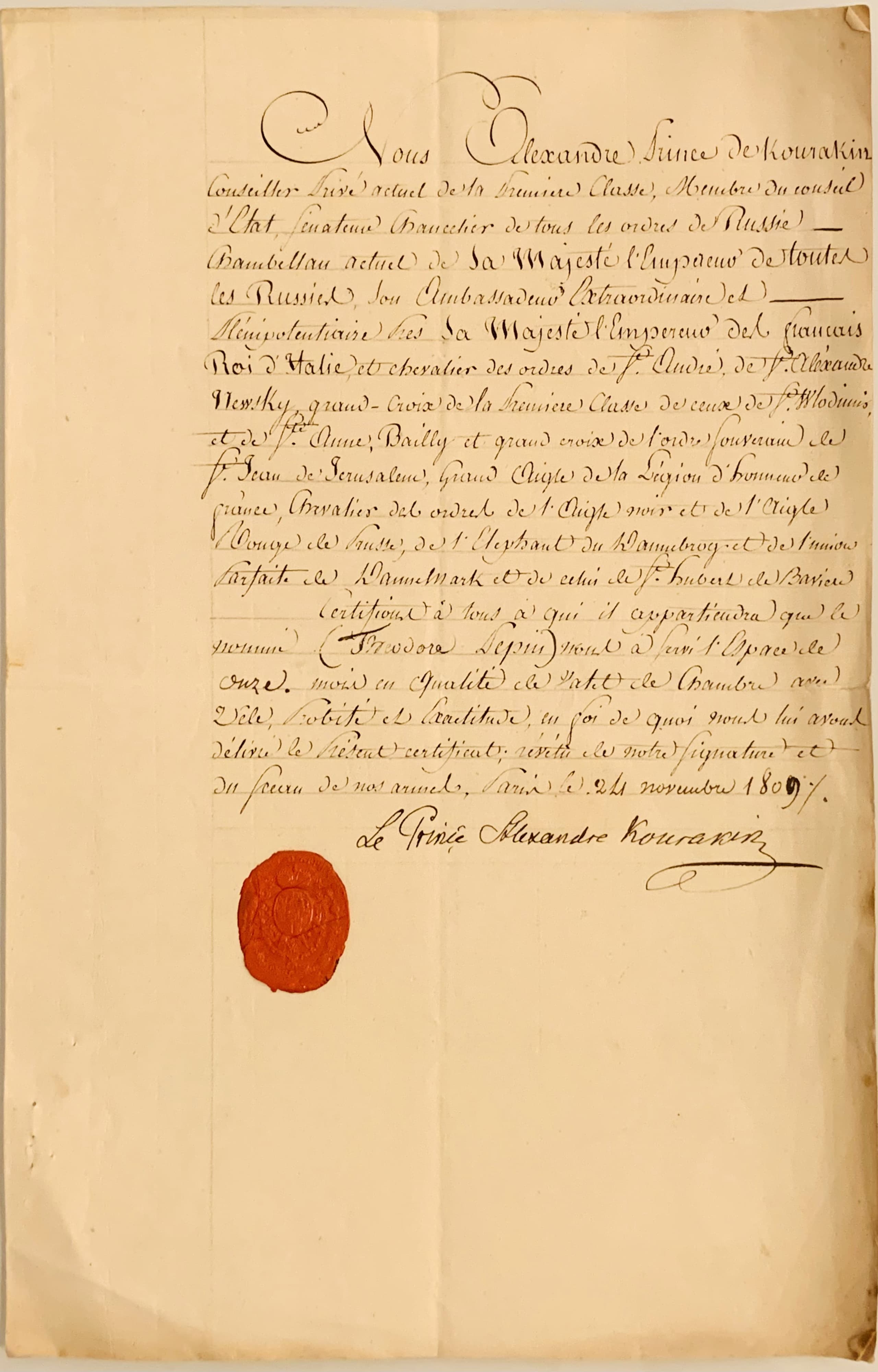 Double feuillet in-folio, cachet de cire rouge aux armes du Prince A.B. Kourakine. Lettre signée.