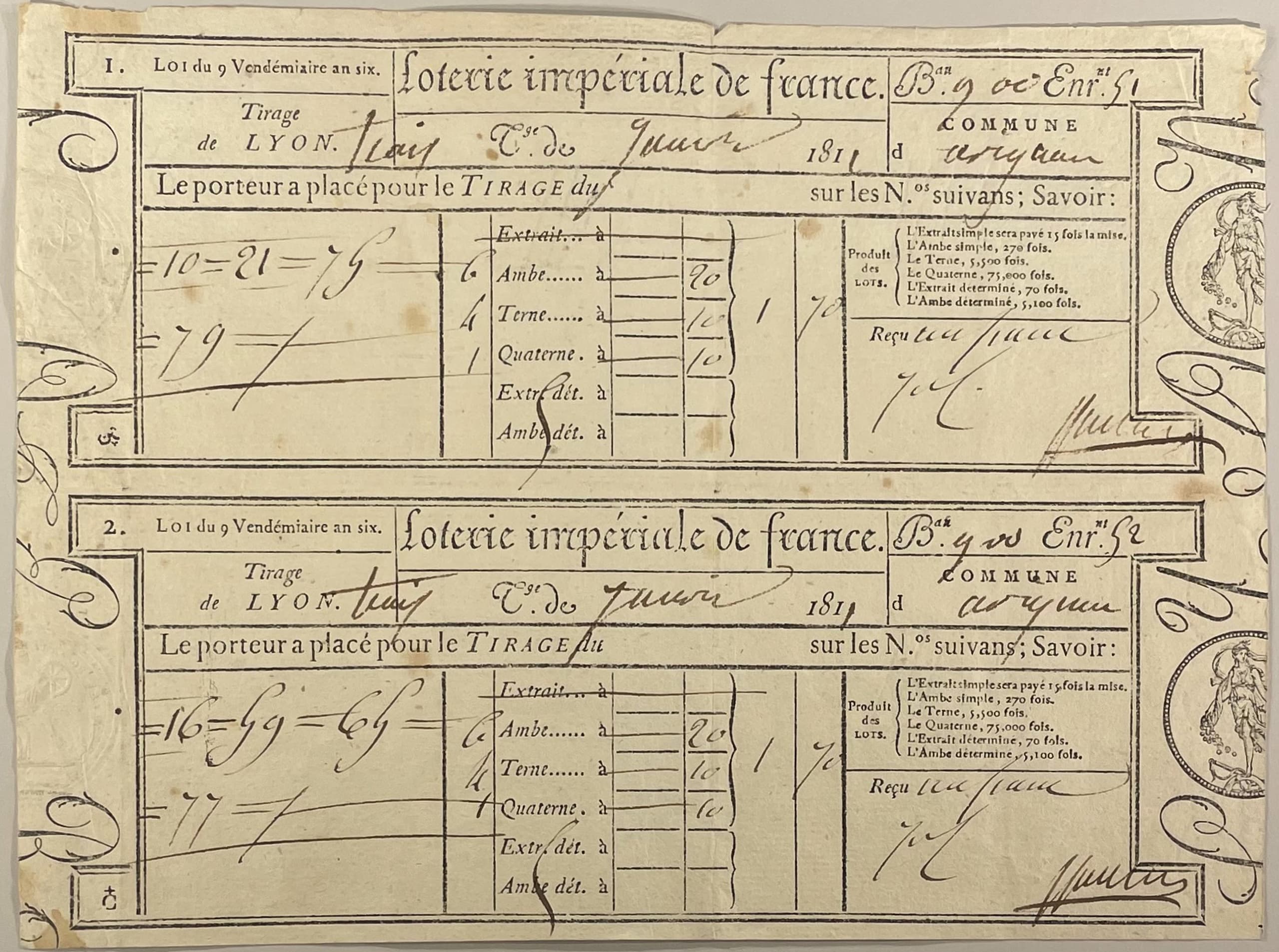 2 BILLETS DU TIRAGE DE LYON, 1811