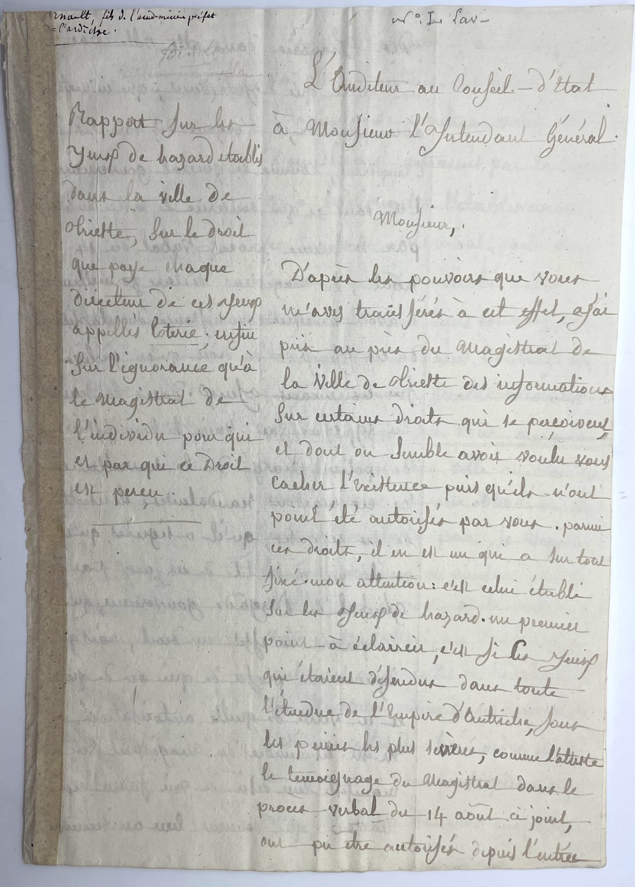 'Rapport sur les jeux de hasard établis dans la ville de Trieste, sur le droit que paye chaque directeur de ces jeux appelés loterie ; enfin sur l'ignorance qu'a le magistrat de l'individu pour qui et par qui ce Droit est perçu.'