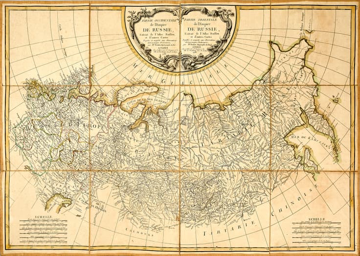 LOUIS GABRIEL SUCHET (1770-1826) Parties Occidentale et Orientale de l’Empire de Russie, extrait de L’Atlas Russien et d’autres cartes. Projetee et assujetie aux observations Astronomiques Posterieures, par Mr. Bonne, Hydrographe du Roi. Paris, chez Lattre, rue St. Jacques, a la vill de Bordeaux, Avec Pr. Du Roy, 1785.