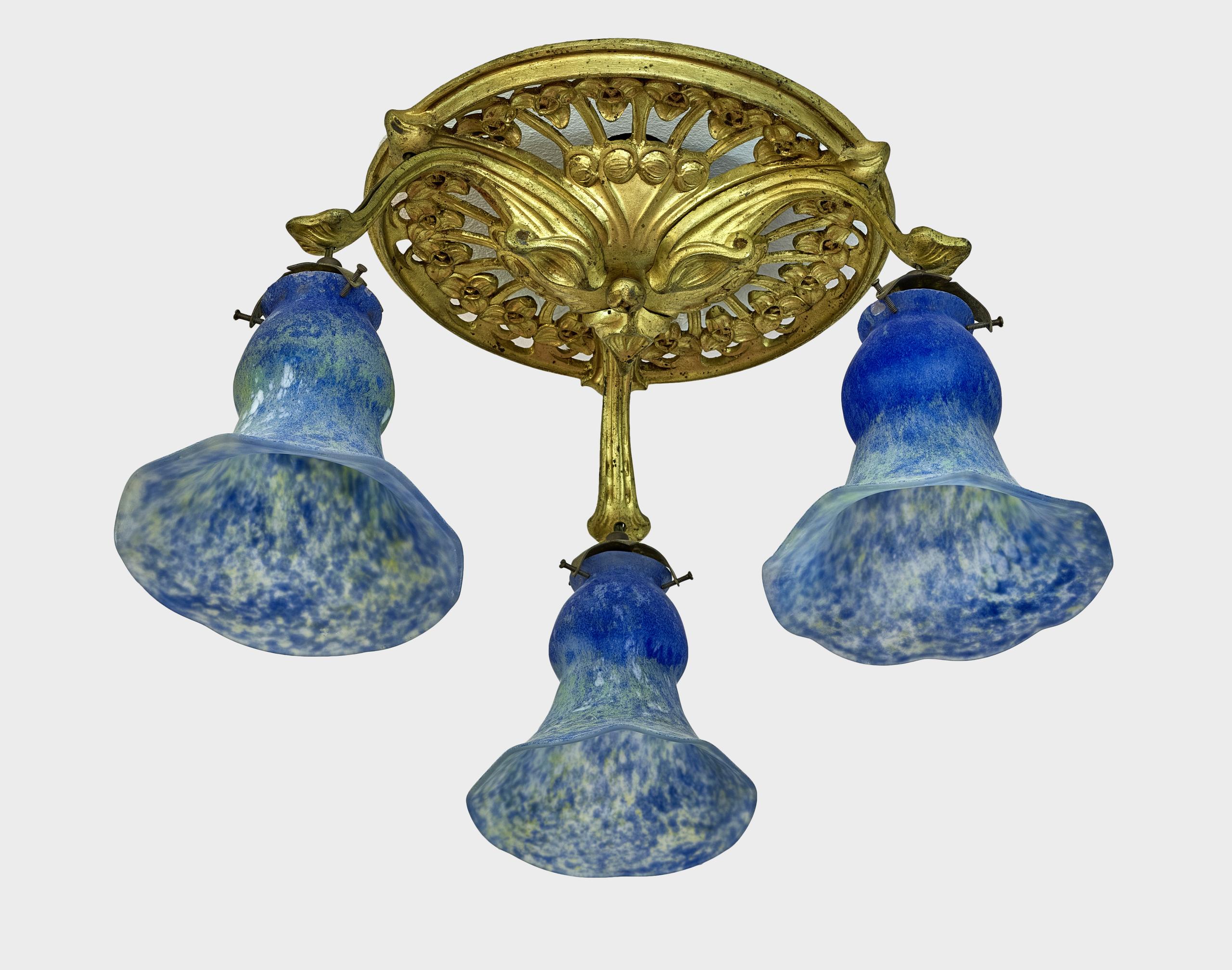 DAUM FRERES LOUIS MAJORELLE (1859-1926) Four chased gilt bronze ceiling lights supporting three Daum tulips in blue marbled glass