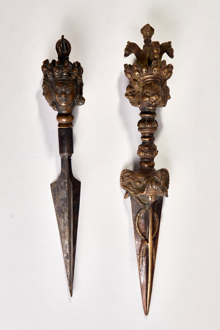 each with a shaft carved with four fierce faces, one representing Mahākāla, the other Hayagrīva, both crowned with a half-vajra finial. One of the blades emerges from the open jaws of a makara H. 27 cm and 32 cm