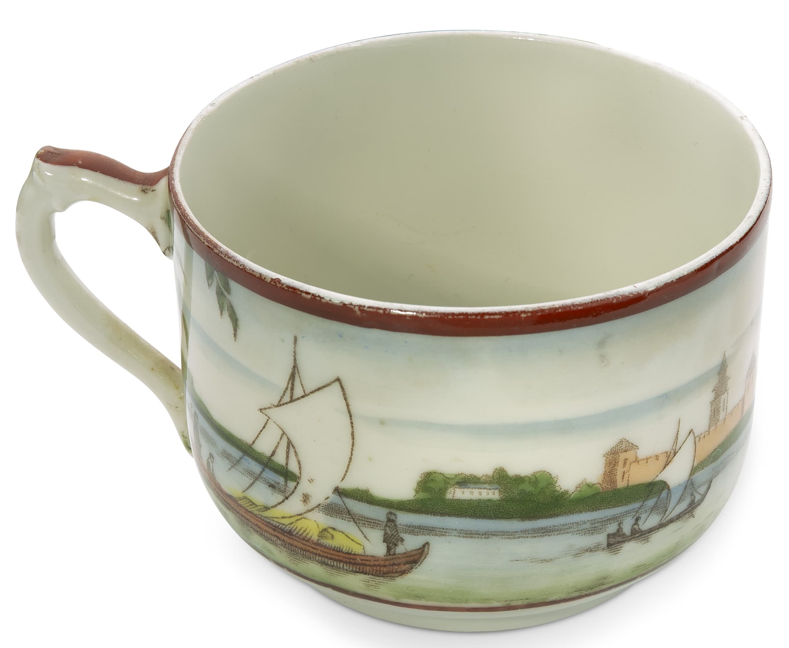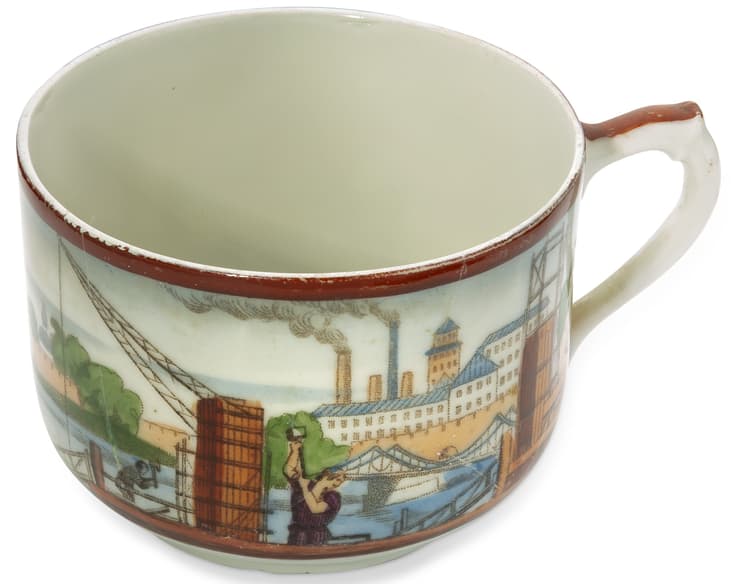 SOVIET PORCELAIN CUP DEPICTING A WORKER WITH HAMMER BEFORE A FACTORY AND CRANES