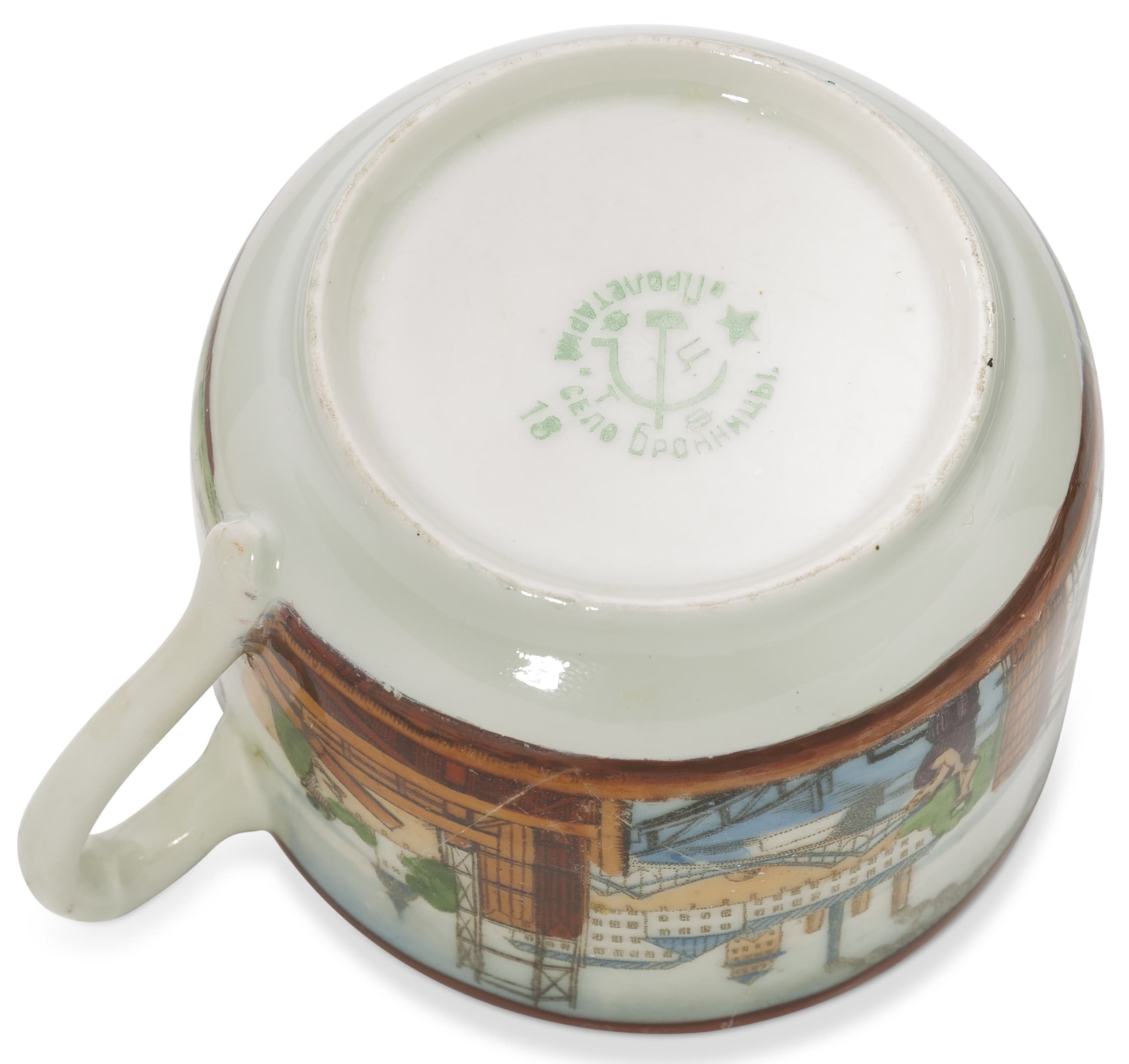 Marks: green mark in Cyrillic ‘PROLETARIY. Selo BRONNITSY’ around a hammer and sickle with star, and the monogram in Cyrillic ‘Ts.F.F.T.’ for Tsentrofarforfayanstrest (Central Porcelain and Faience Trust)