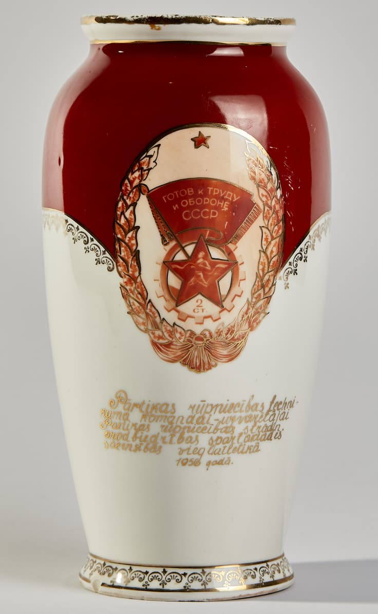 decorated with the emblem Gotov k Trudu i Oborone SSSR [Ready for Labour and Defence of the USSR], large red five-pointed star inside a cogwheel) and a golden wreath, inscription in Latvian