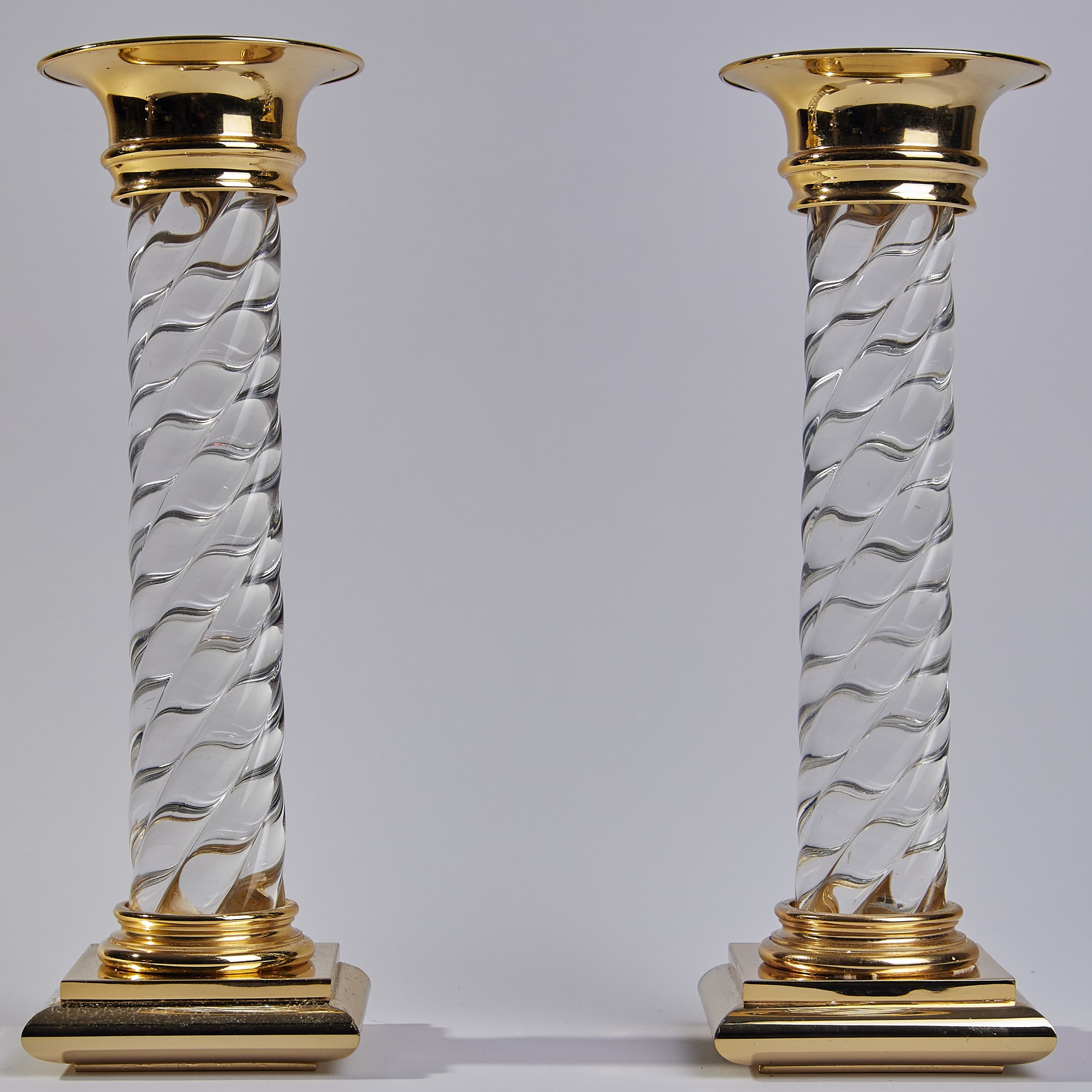 PAIR OF COLONNADE-SHAPED GLASS AND GILDED BRASS CANDLESTICKS