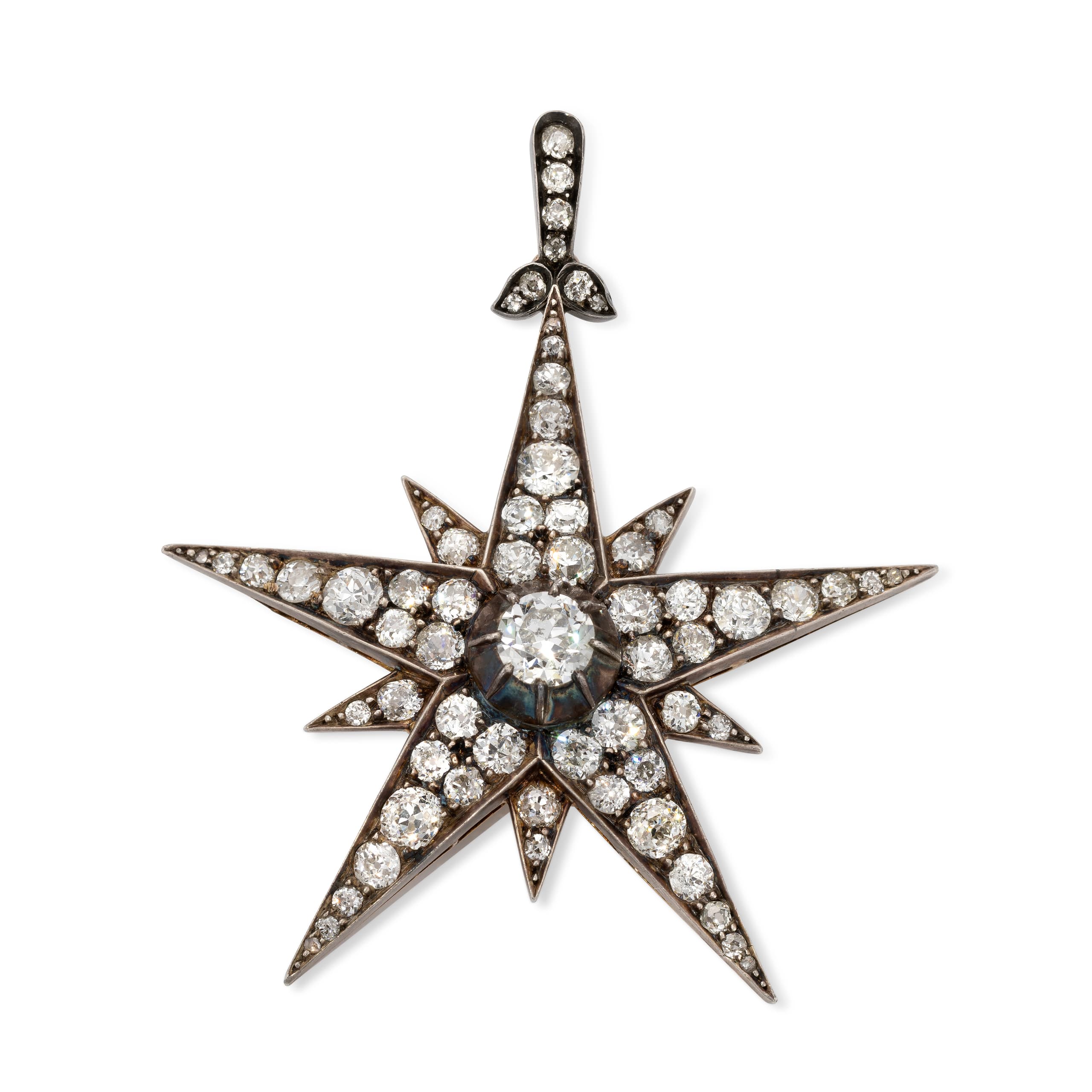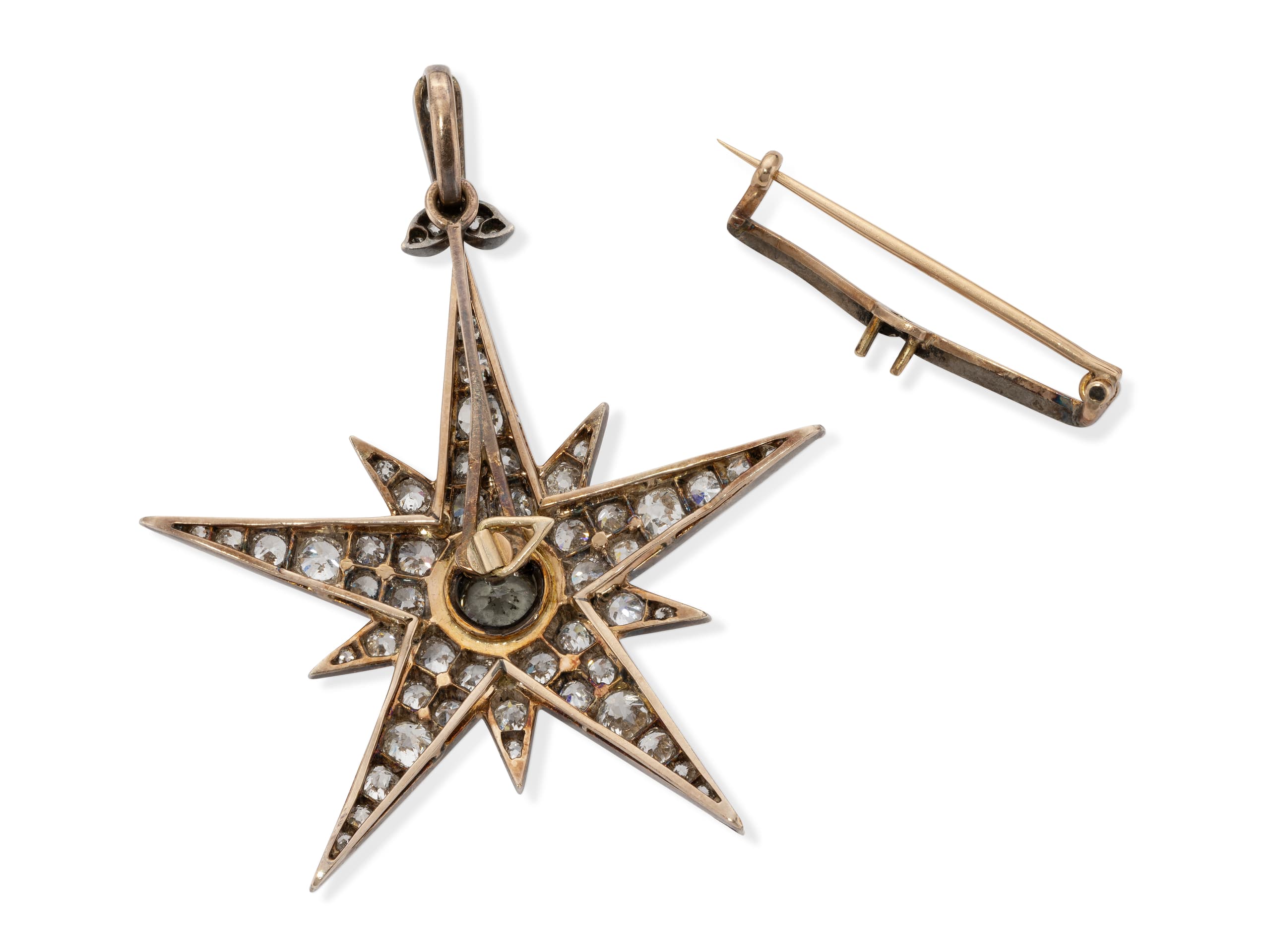 Napoléon III star-shape pendant made in 18k yellow gold and silver set old-cut diamonds weighing approximately 3.50 ct. and set with a central old-cut diamond weighing 0.60 ct. 7 x 6 cm gross weight : 12.82 gr. Can be worn as a brooch with a pin claps system inclued