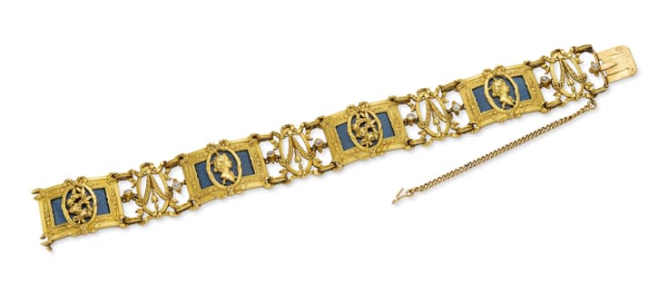 XIXth century bracelet in 18k yellow gold decorated with neoclassical patterns of femal profiles and plants scrolls adorned with blue enamel